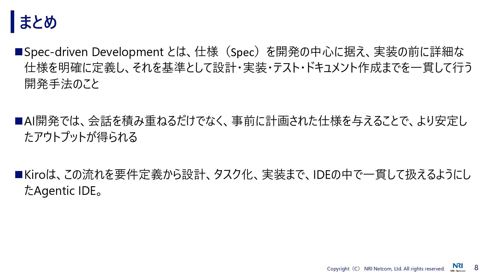 とは、仕様(Spec)を開発の中心に据え、実装の前に詳細な 仕様を明確に定義し、それを基準として設計・実装・テスト・ドキュメント作成までを一貫して行う 開発手法のこと ◼AI開発では、会話を積み重ねるだけでなく、事前に計画された仕様を与えることで、より安定し たアウトプットが得られる ◼Kiroは、この流れを要件定義から設計、タスク化、実装まで、IDEの中で一貫して扱えるようにし たAgentic IDE。 まとめ