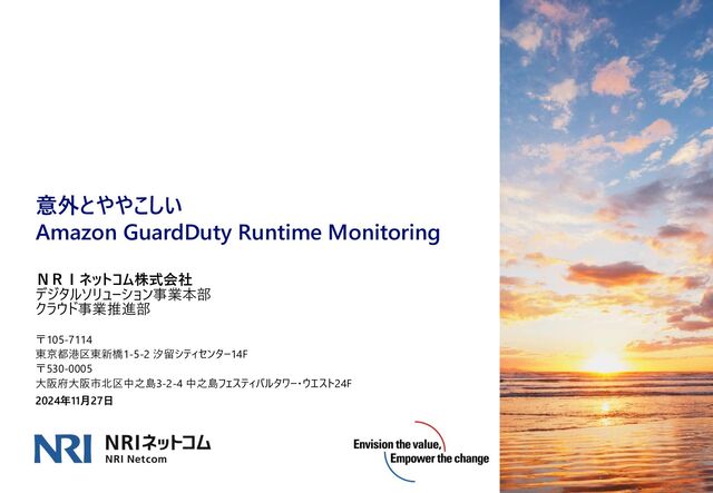 ◼ 主にログを見て不審なアクティビティを検出する ◼ 有効化可能な項目 ⚫ S3 Protection ⚫ EKS Protection ⚫ Malware Protection for Amazon EC2 ⚫ Malware Protection for Amazon S3 ⚫ RDS Protection ⚫ Lambda Protection ⚫ Runtime Monitoring • EKS(re:Invent 2023以前から存在) • EC2 • ECS GuardDuty Runtime Monitoringとは 意外とややこしい Amazon GuardDuty Runtime Monitoring そもそもAmazon GuardDutyとは Amazon GuardDuty AWS CloudTrail Flow logs Amazon Simple Storage Service (Amazon S3) Amazon Relational Database Service (Amazon RDS) AWS Lambda Amazon Virtual Private Cloud (Amazon VPC) ログ監視