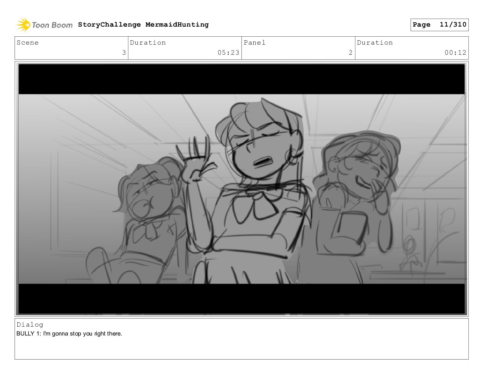 Scene 3 Duration 05:23 Panel 1 Duration 00:12 Dialog BULLY