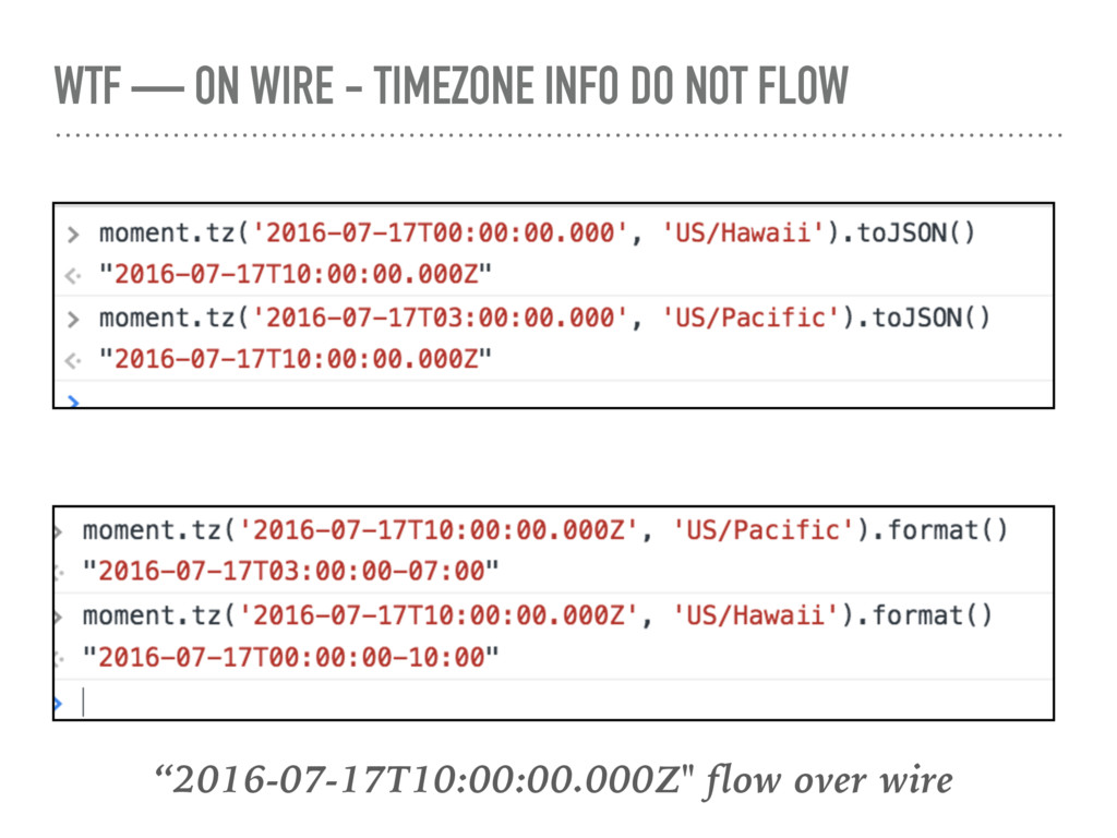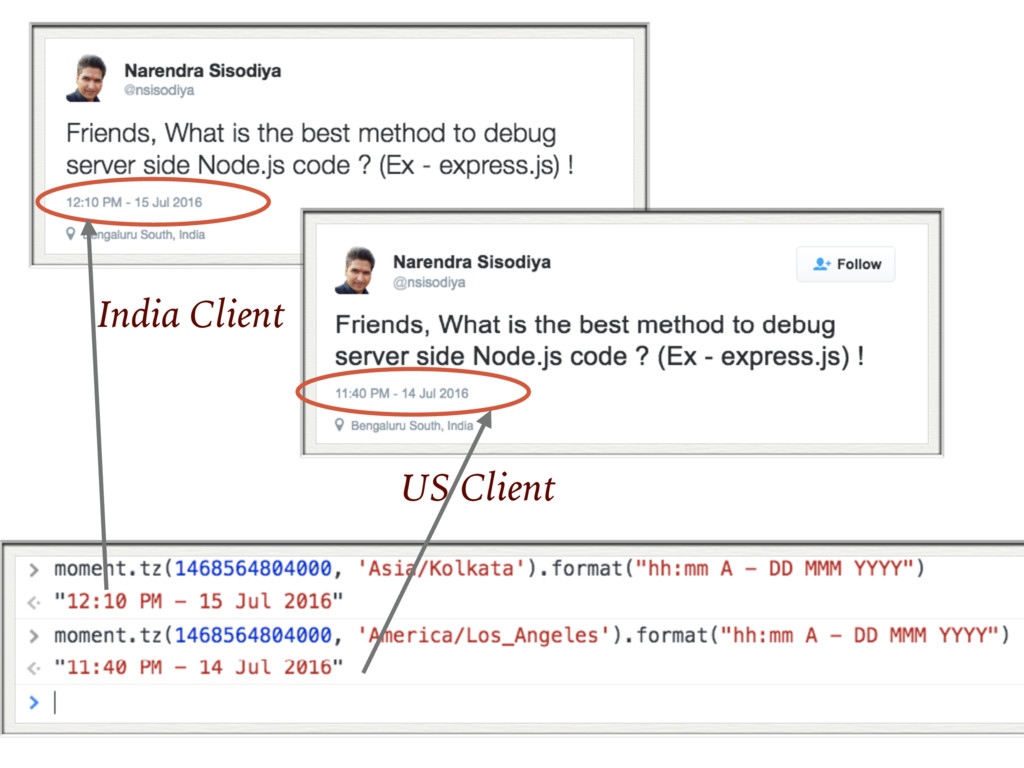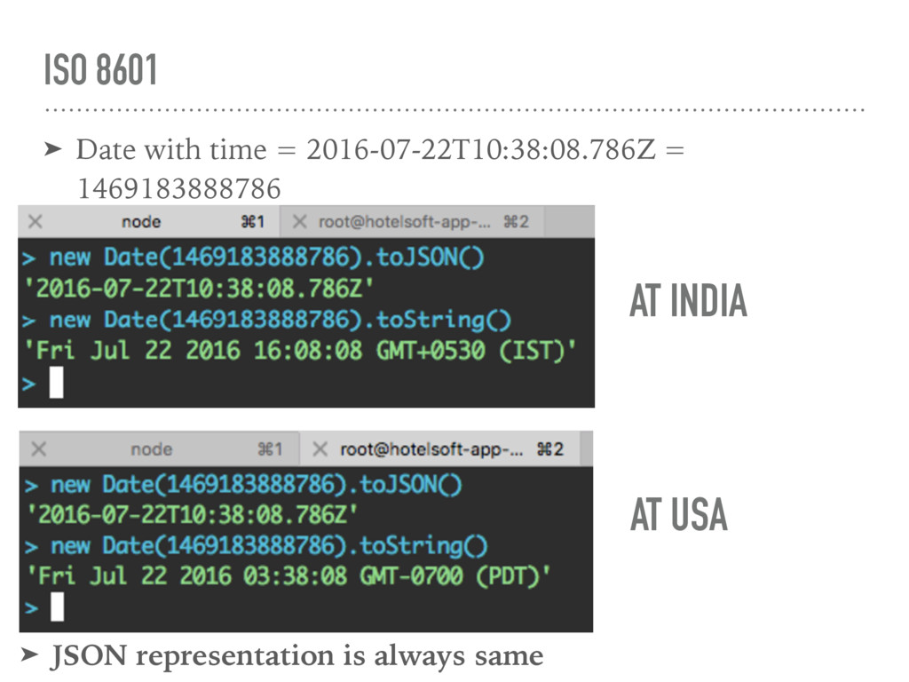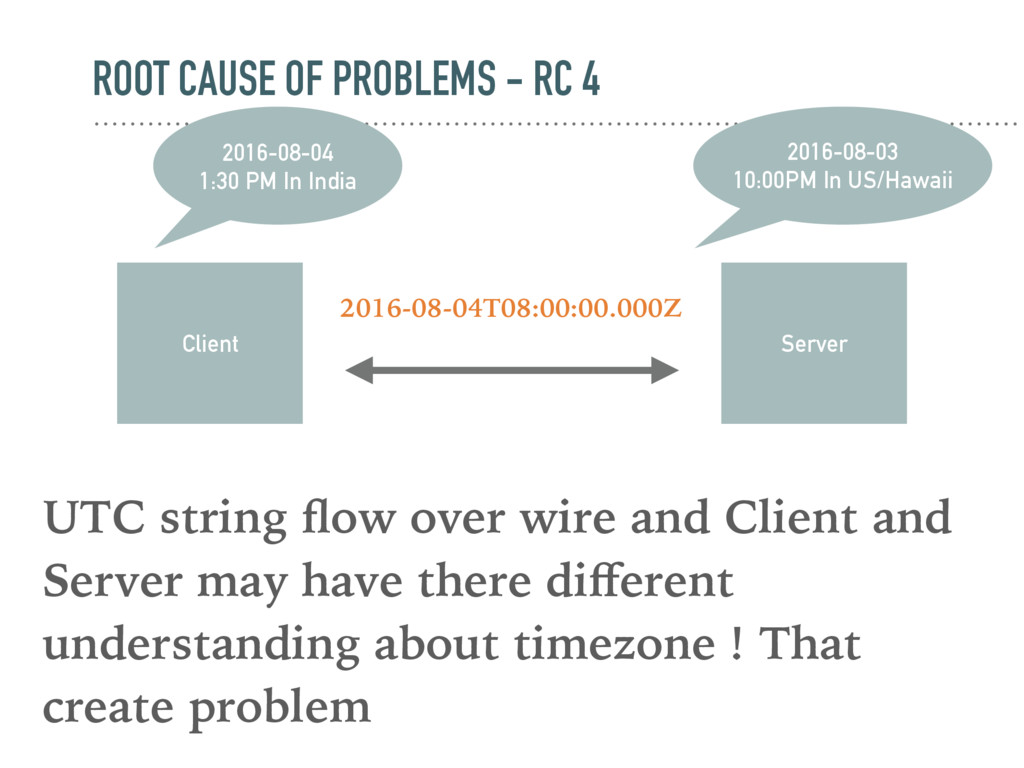over wire and Client and Server may have there different understanding about timezone ! That create problem Client Server 2016-08-04T08:00:00.000Z 2016-08-04 1:30 PM In India 2016-08-03 10:00PM In US/Hawaii