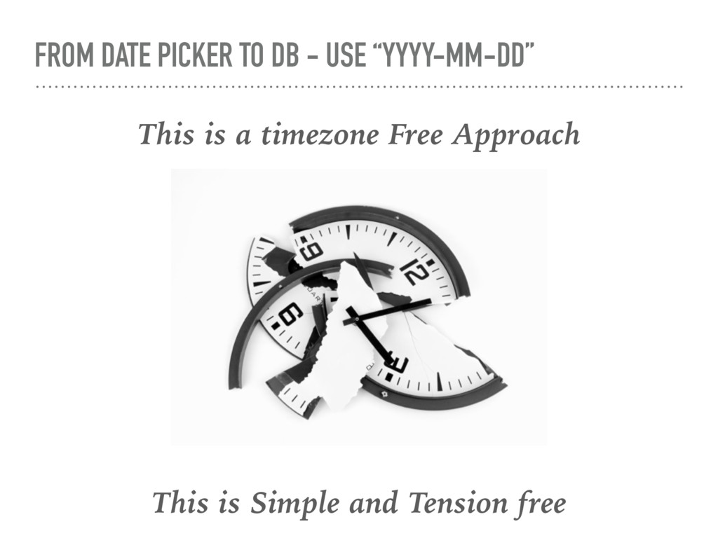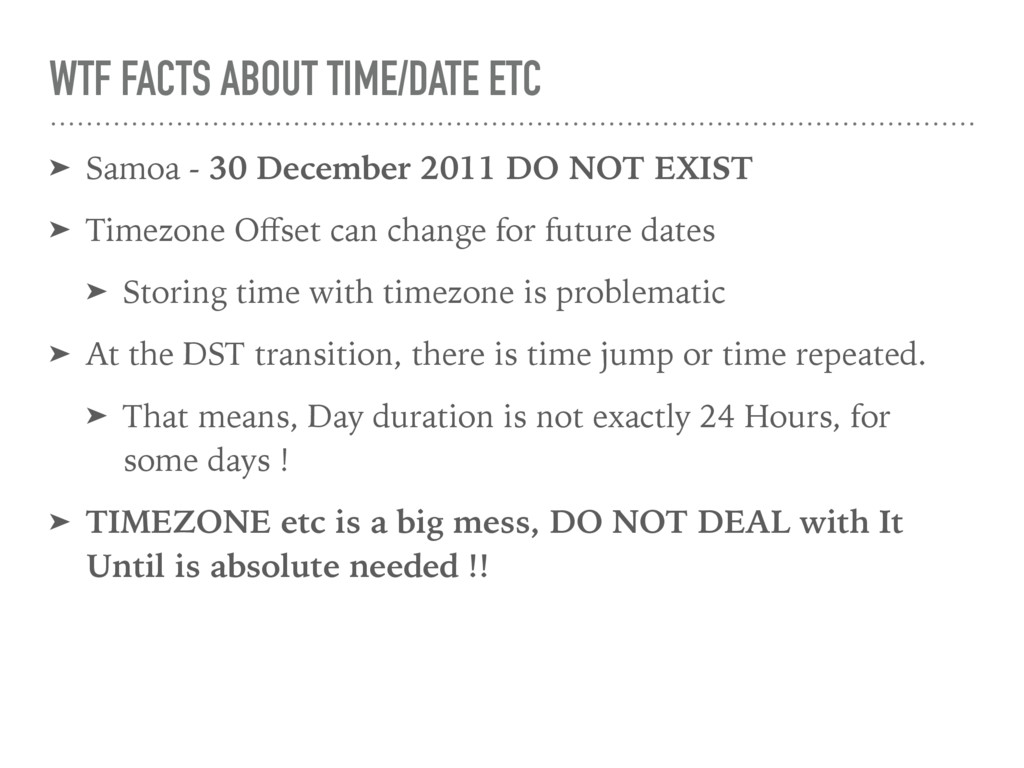 2011 DO NOT EXIST ➤ Timezone Offset can change for future dates ➤ Storing time with timezone is problematic ➤ At the DST transition, there is time jump or time repeated. ➤ That means, Day duration is not exactly 24 Hours, for some days ! ➤ TIMEZONE etc is a big mess, DO NOT DEAL with It Until is absolute needed !!