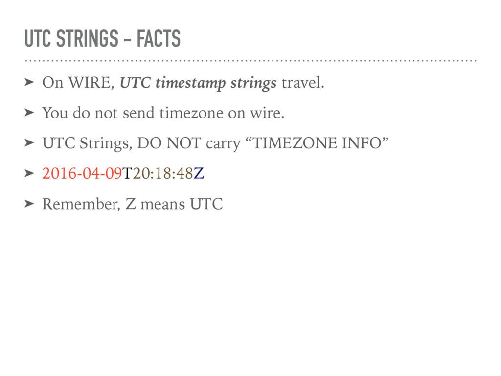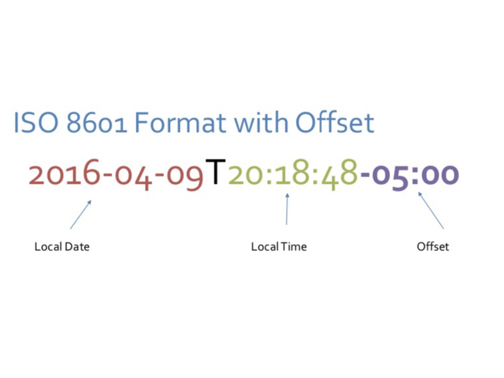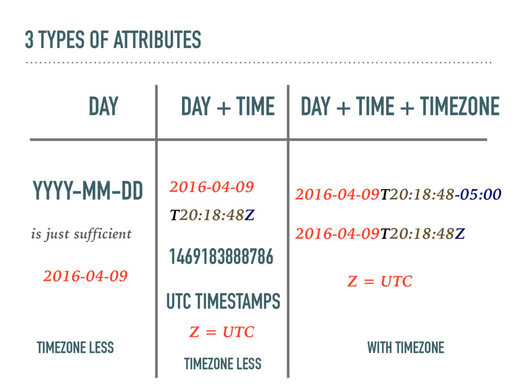 TIME + TIMEZONE TIMEZONE LESS WITH TIMEZONE TIMEZONE LESS YYYY-MM-DD is just sufficient 2016-04-09T20:18:48-05:00 2016-04-09 2016-04-09T20:18:48Z Z = UTC 1469183888786 2016-04-09 T20:18:48Z Z = UTC UTC TIMESTAMPS