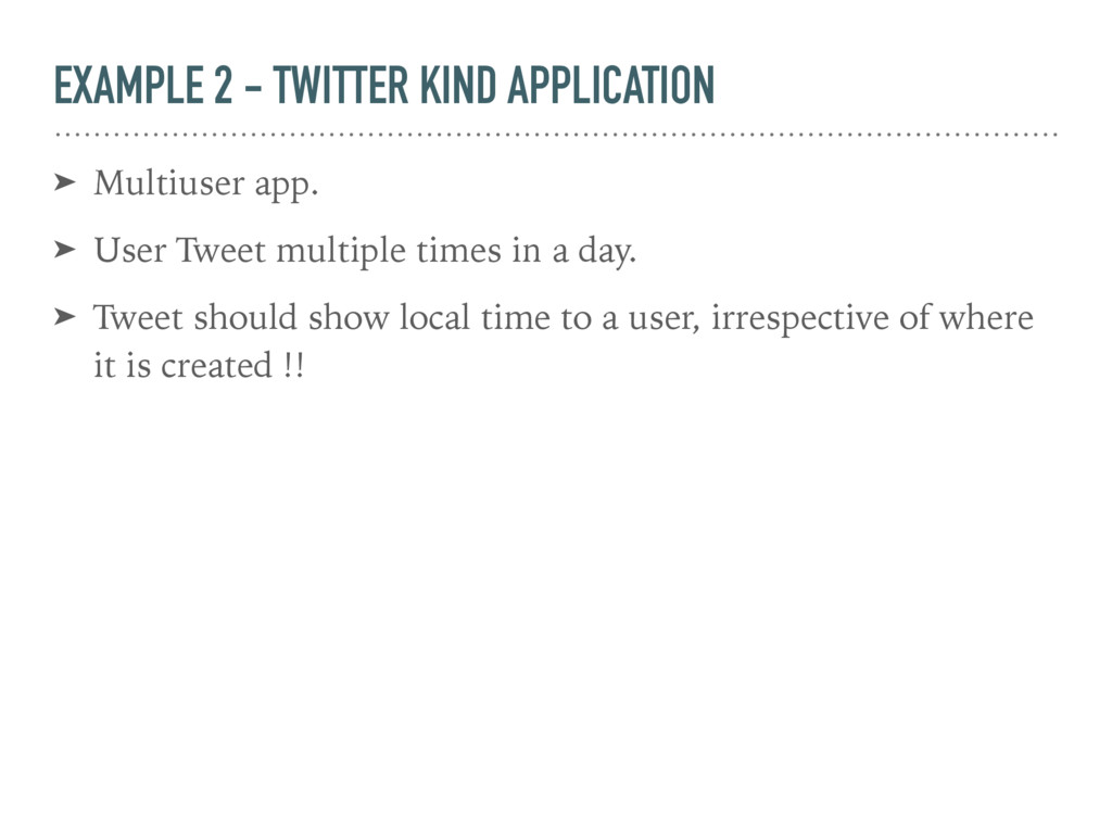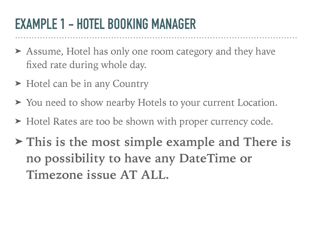 only one room category and they have fixed rate during whole day. ➤ Hotel can be in any Country ➤ You need to show nearby Hotels to your current Location. ➤ Hotel Rates are too be shown with proper currency code. ➤ This is the most simple example and There is no possibility to have any DateTime or Timezone issue AT ALL.