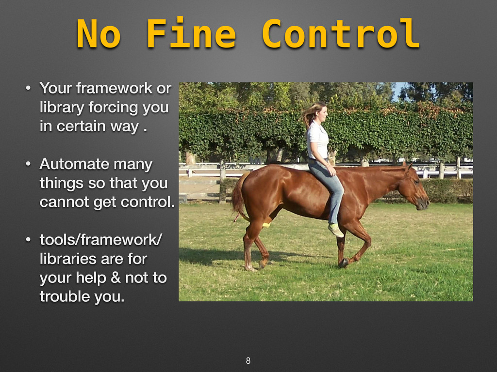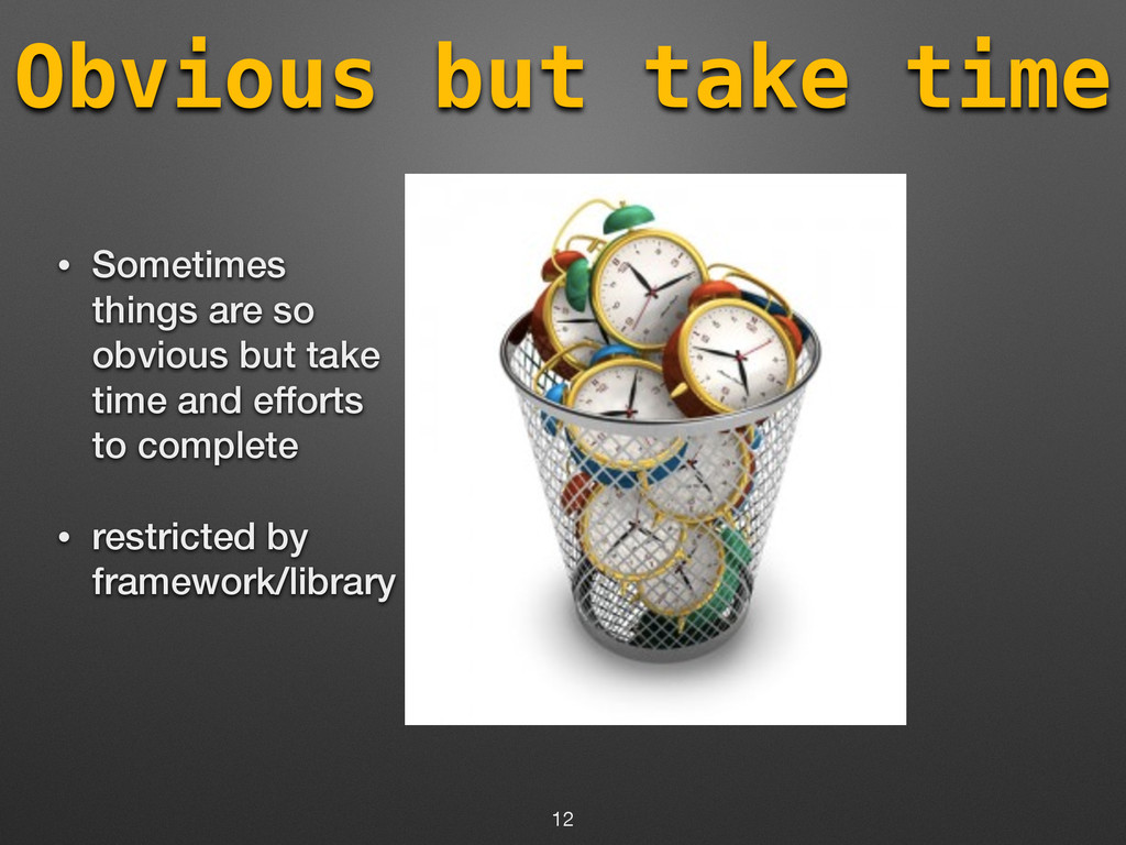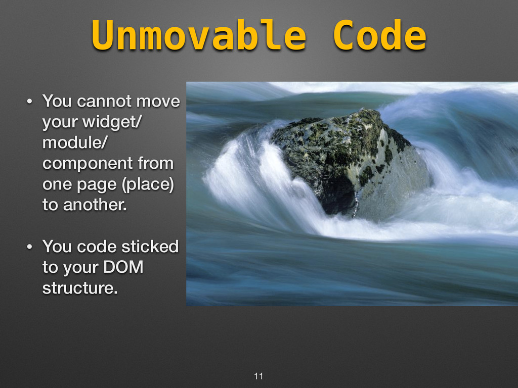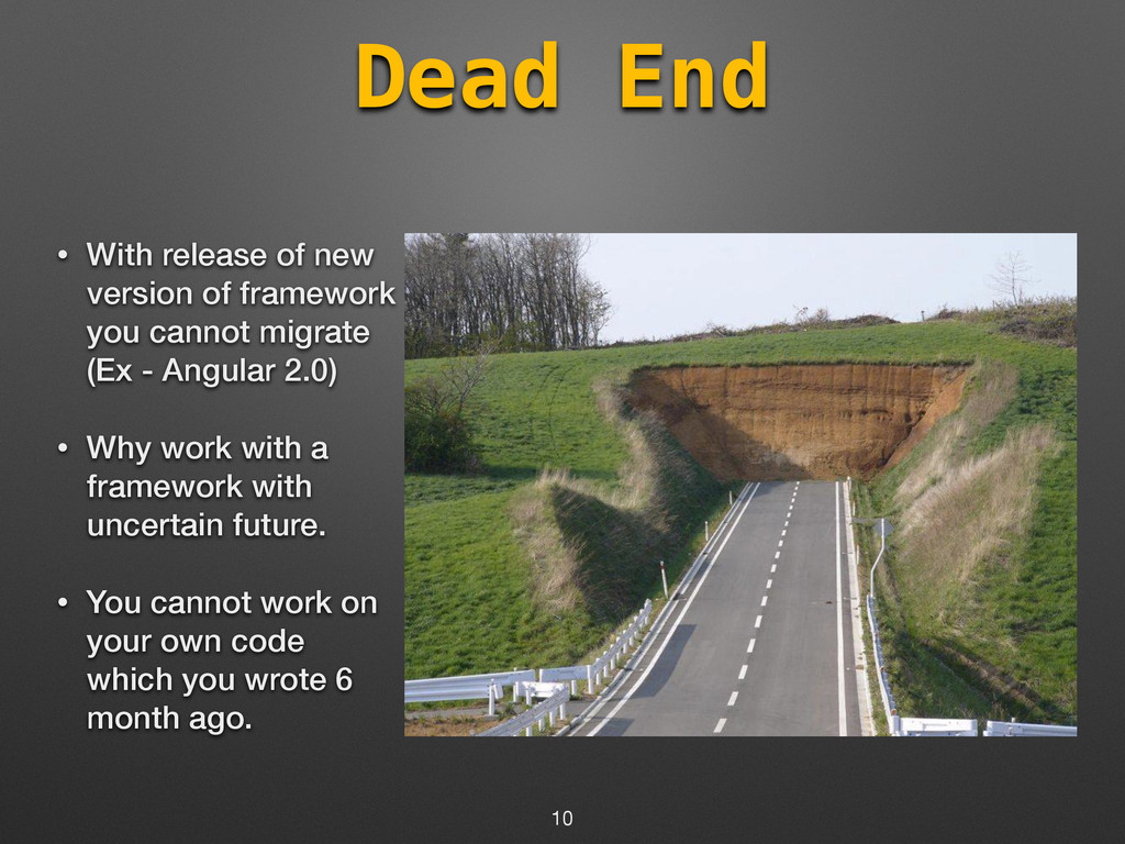 you cannot migrate (Ex - Angular 2.0) • Why work with a framework with uncertain future. • You cannot work on your own code which you wrote 6 month ago. 10
