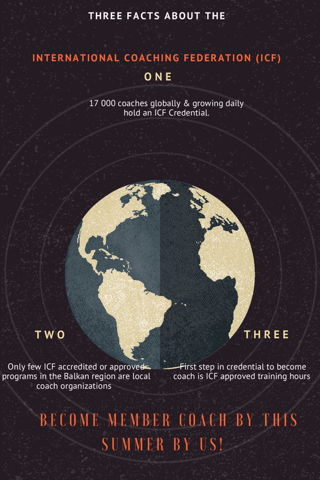 C O M E M E M B E R C O A C H B Y T H I S S U M M E R B Y U S ! O N E 17 000 coaches globally & growing daily hold an ICF Credential. T W O Only few ICF accredited or approved programs in the Balkan region are local coach organizations T H R E E First step in credential to become coach is ICF approved training hours