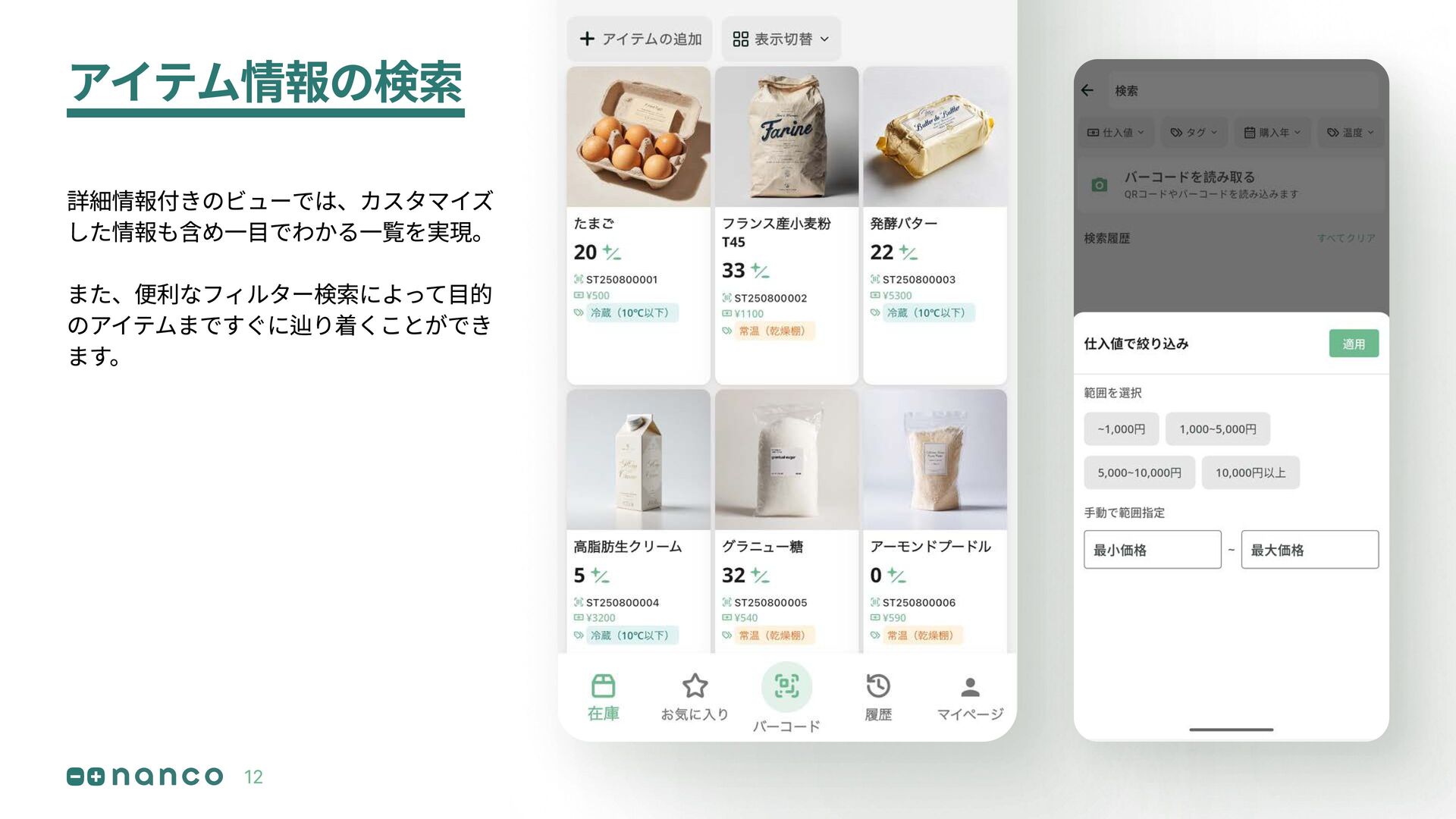 例: アイテム情報のカスタマイズ あなた専用のデータベースを用意して 自社に必要な情報をすべて登録しましょう。 必要な情報を 自由に追加できます 11