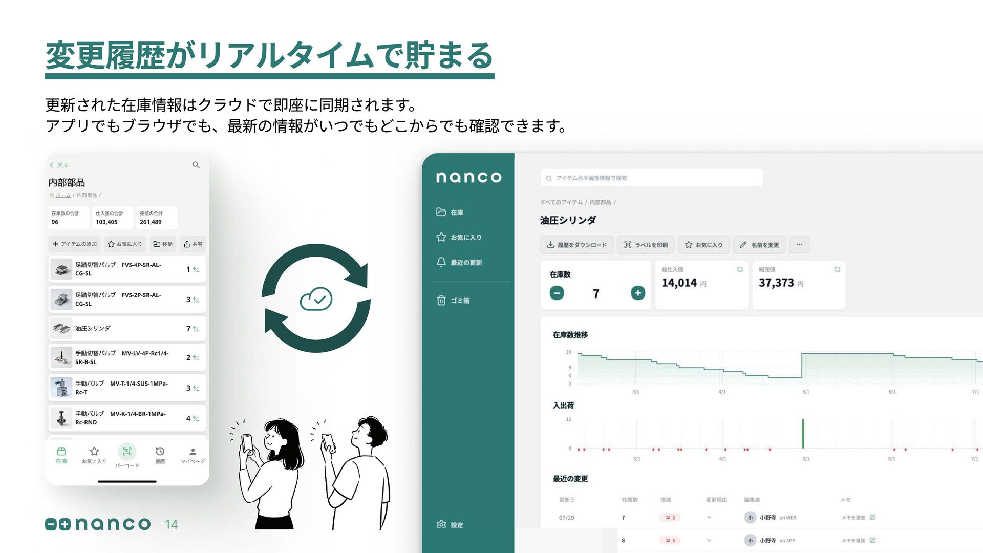 変更履歴がリアルタイムで貯まる 更新された在庫情報はクラウドで即座に同期されます。 アプリでもブラウザでも、最新の情報がいつでもどこからでも確認できます。 14