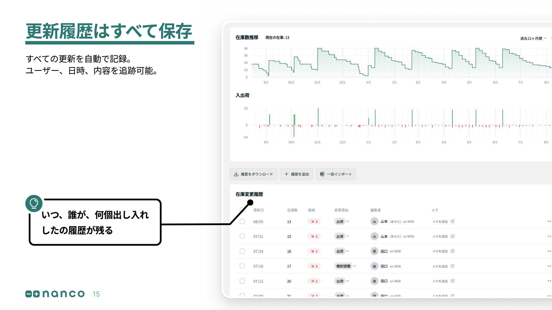 更新履歴はすべて保存 すべての更新を自動で記録。 ユーザー、日時、内容を追跡可能。 いつ、誰が、何個出し入れ したの履歴が残る 15