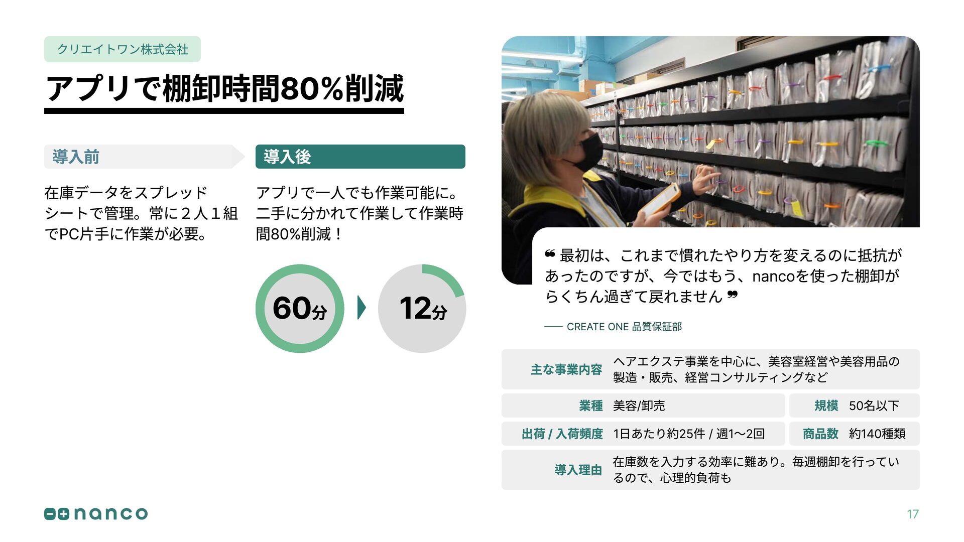 ❝ 最初は、これまで慣れたやり方を変えるのに抵抗が あったのですが、今ではもう、nancoを使った棚卸が らくちん過ぎて戻れません ❞ CREATE ONE 品質保証部 導入前 導入後
