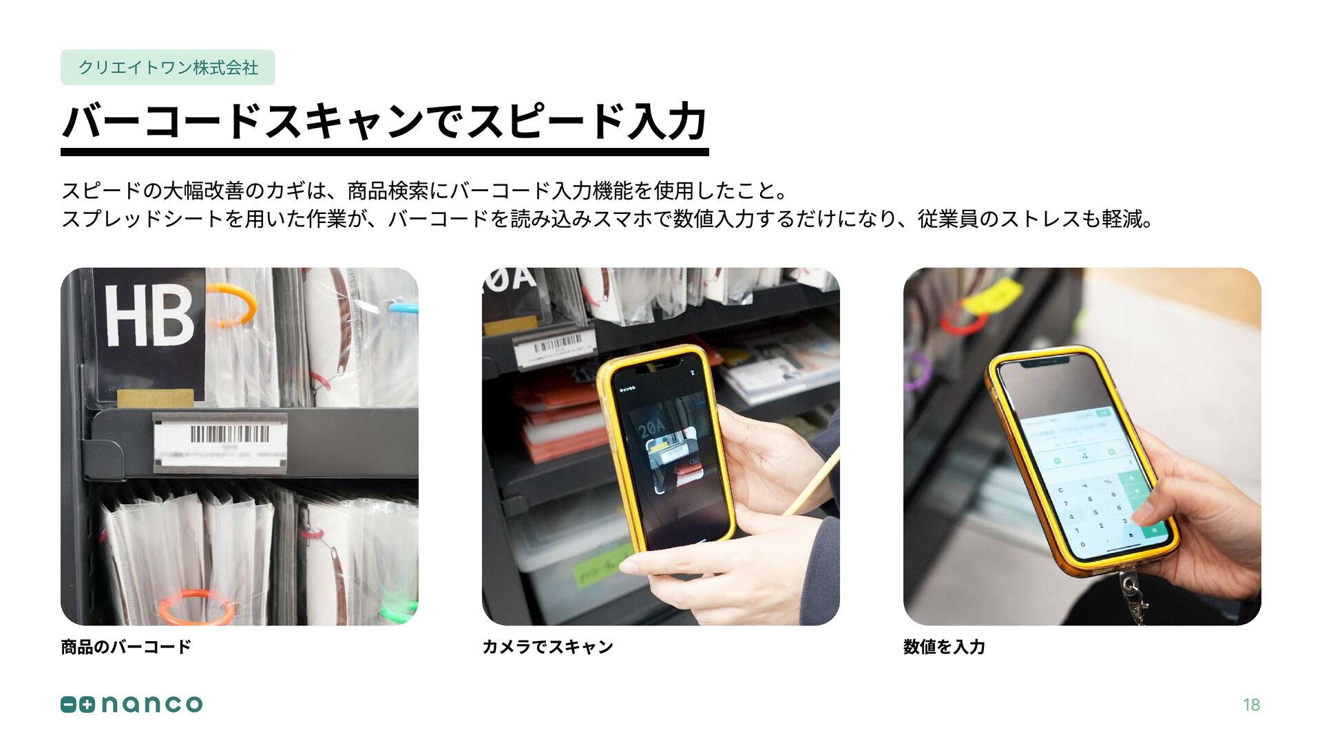 バーコードスキャンでスピード入力 クリエイトワン株式会社 スピードの大幅改善のカギは、商品検索にバーコード入力機能を使用したこと。 スプレッドシートを用いた作業が、バーコードを読み込みスマホで数値入力するだけになり、従業員のストレスも軽減。 商品のバーコード カメラでスキャン 数値を入力 18
