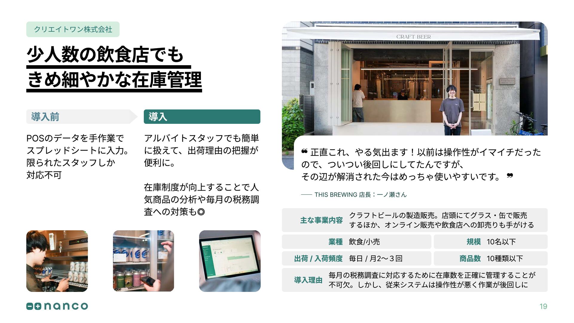 クリエイトワン株式会社 出荷 / 入荷頻度 毎日 / 月2~3回 主な事業内容 クラフトビールの製造販売。店頭にてグラス・缶で販売 するほか、オンライン販売や飲食店への卸売りも手がける 業種 飲食/小売 規模 10名以下 商品数 10種類以下 19 毎月の税務調査に対応するために在庫数を正確に管理することが 不可欠。しかし、従来システムは操作性が悪く作業が後回しに 導入理由 少人数の飲食店でも きめ細やかな在庫管理 POSのデータを手作業で スプレッドシートに入力。 限られたスタッフしか 対応不可 アルバイトスタッフでも簡単 に扱えて、出荷理由の把握が 便利に。 在庫制度が向上することで人 気商品の分析や毎月の税務調 査への対策も◎