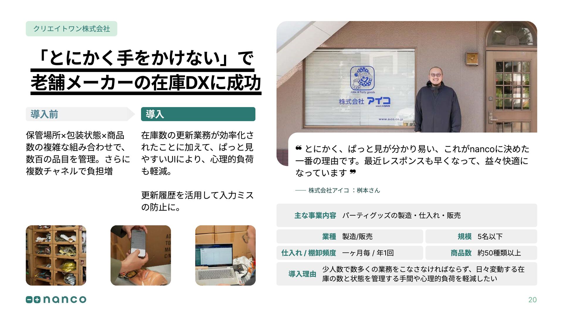❝ とにかく、ぱっと見が分かり易い、これがnancoに決めた 一番の理由です。最近レスポンスも早くなって、益々快適に なっています ❞ 株式会社アイコ :桝本さん 導入前 導入 クリエイトワン株式会社