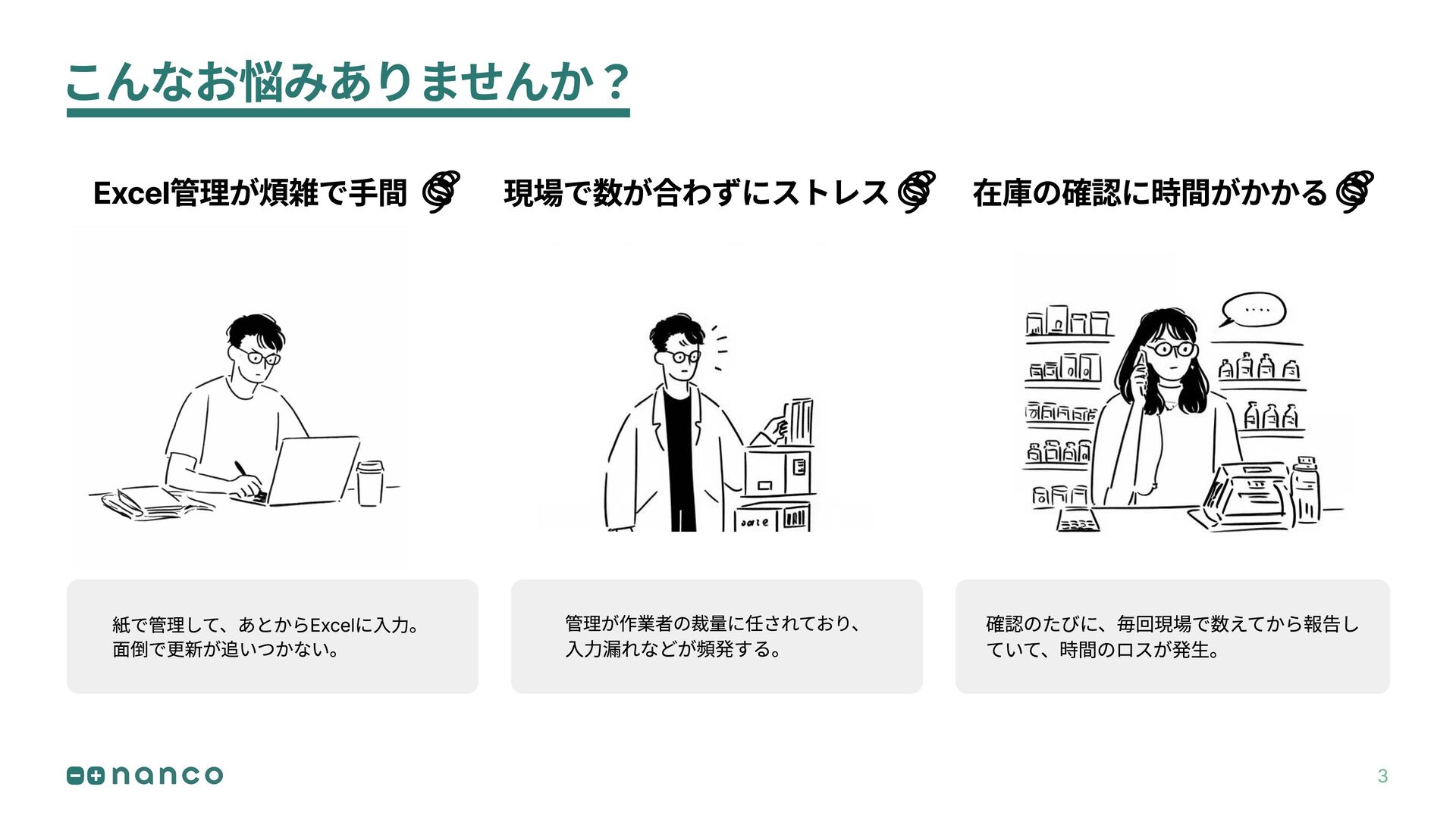2 1 在庫管理を楽に行える クラウドならではの 便利な機能がたくさん で解決! 4 Excel管理が煩雑で手間 現場で数が合わずにストレス 在庫の確認に時間がかかる 8:15