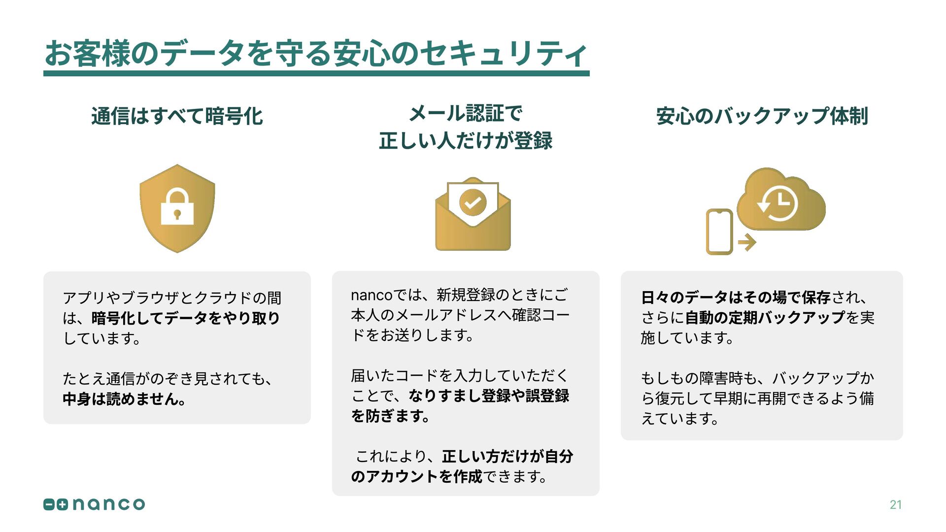 通信はすべて暗号化 メール認証で 正しい人だけが登録 安心のバックアップ体制 お客様のデータを守る安心のセキュリティ nancoでは、新規登録のときにご 本人のメールアドレスへ確認コー ドをお送りします。 届いたコードを入力していただく