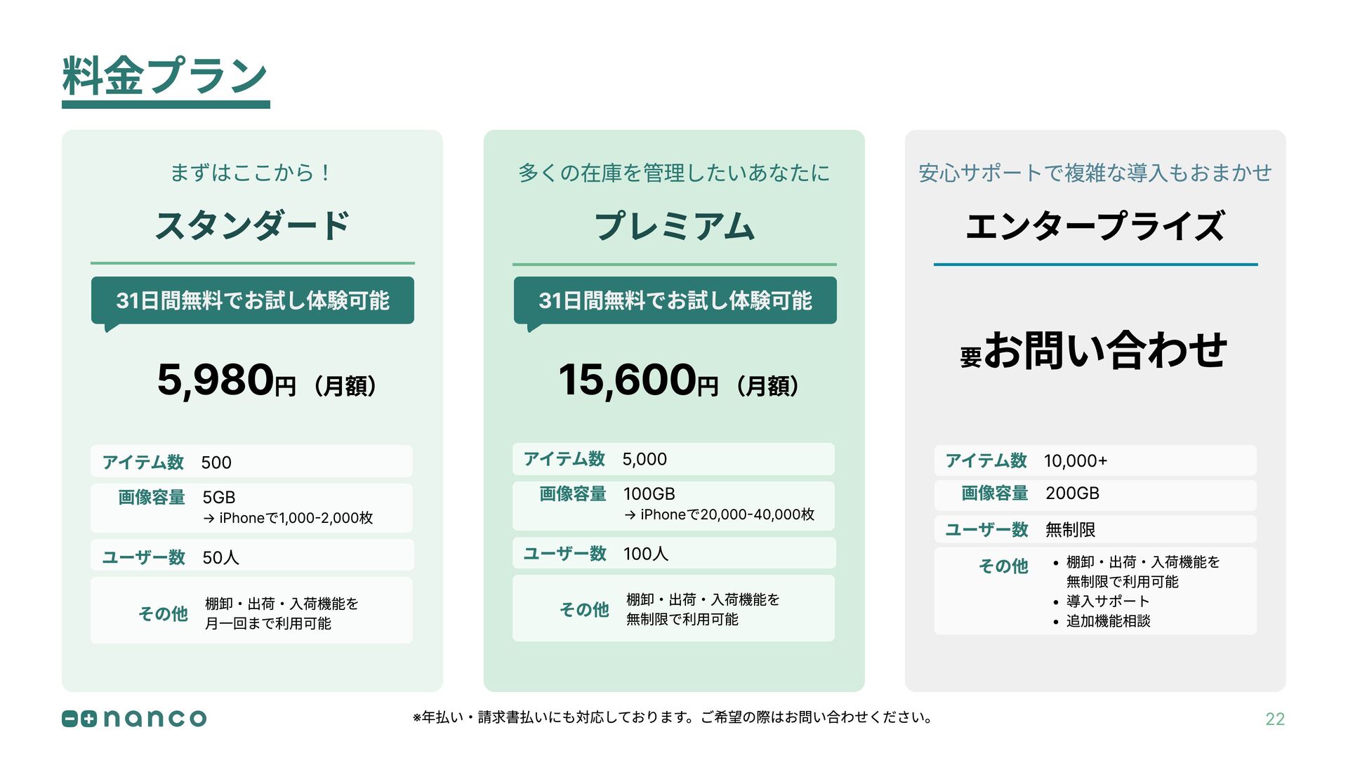 要 お問い合わせ まずはここから! ※年払い・請求書払いにも対応しております。ご希望の際はお問い合わせください。 31日間無料でお試し体験可能 31日間無料でお試し体験可能 アイテム数 500 画像容量 5GB → iPhoneで1,000-2,000枚 ユーザー数 50人 その他 棚卸・出荷・入荷機能を 月一回まで利用可能 アイテム数 5,000 画像容量 100GB → iPhoneで20,000-40,000枚 ユーザー数 100人 その他 棚卸・出荷・入荷機能を 無制限で利用可能 アイテム数 10,000+ 画像容量 200GB ユーザー数 無制限 その他 棚卸・出荷・入荷機能を 無制限で利用可能 導入サポート 追加機能相談 22