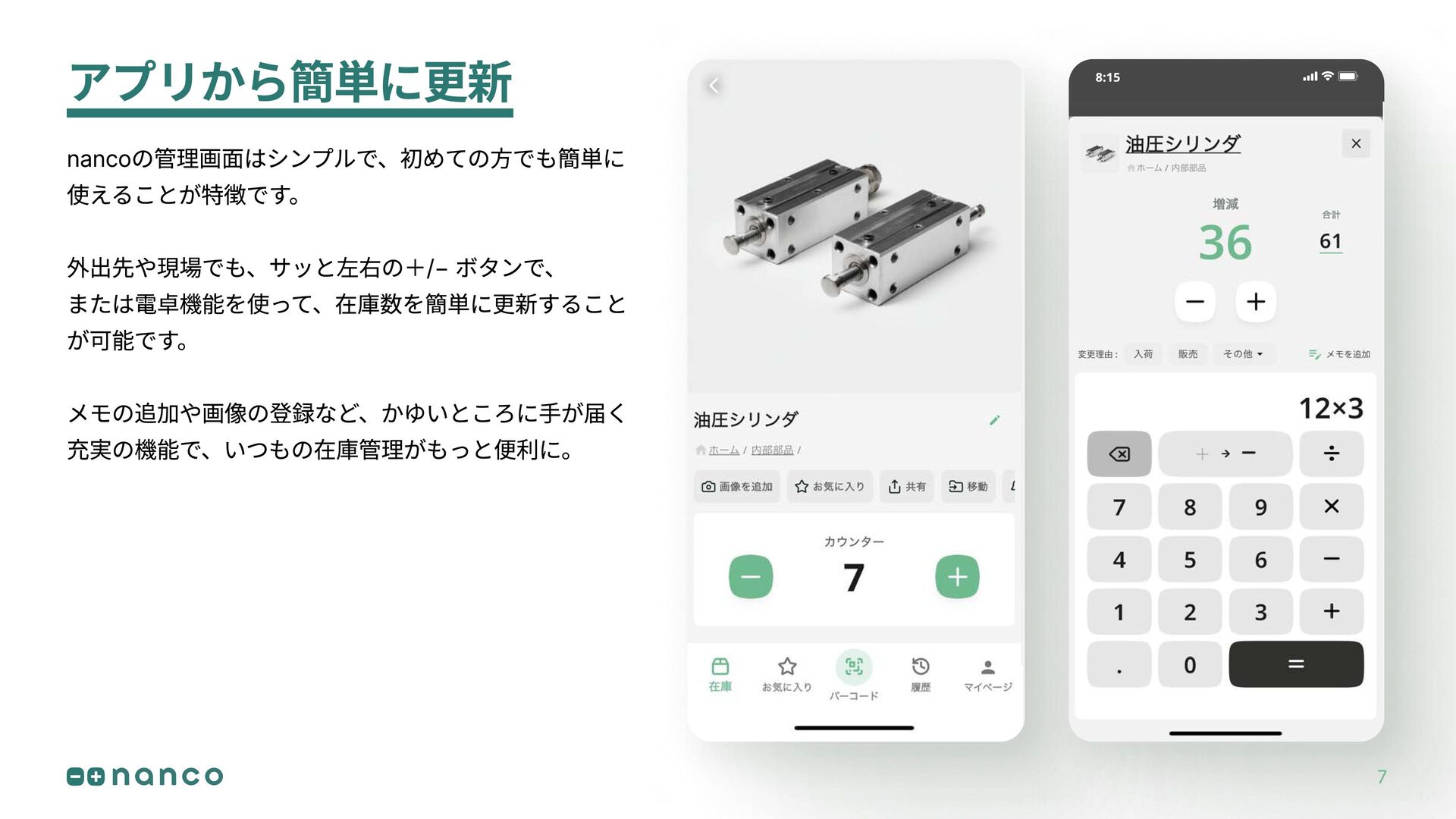 アプリから簡単に更新 nancoの管理画面はシンプルで、初めての方でも簡単に 使えることが特徴です。 外出先や現場でも、サッと左右の+/− ボタンで、 または電卓機能を使って、在庫数を簡単に更新すること が可能です。 メモの追加や画像の登録など、かゆいところに手が届く 充実の機能で、いつもの在庫管理がもっと便利に。 8:15