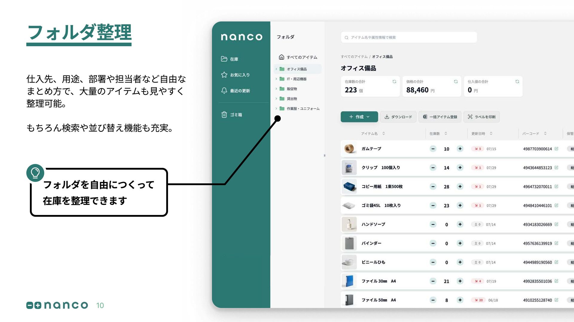 フォルダを自由につくって 在庫を整理できます フォルダ整理 仕入先、用途、部署や担当者など自由な まとめ方で、大量のアイテムも見やすく 整理可能。 もちろん検索や並び替え機能も充実。 10
