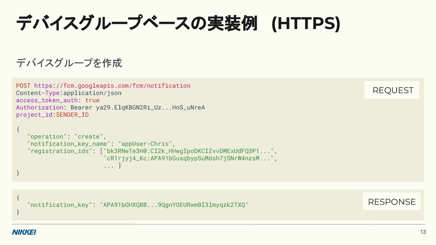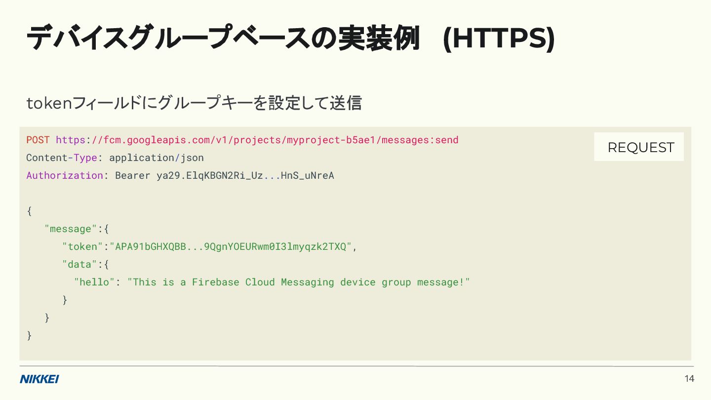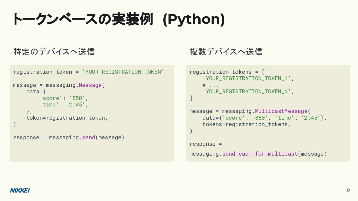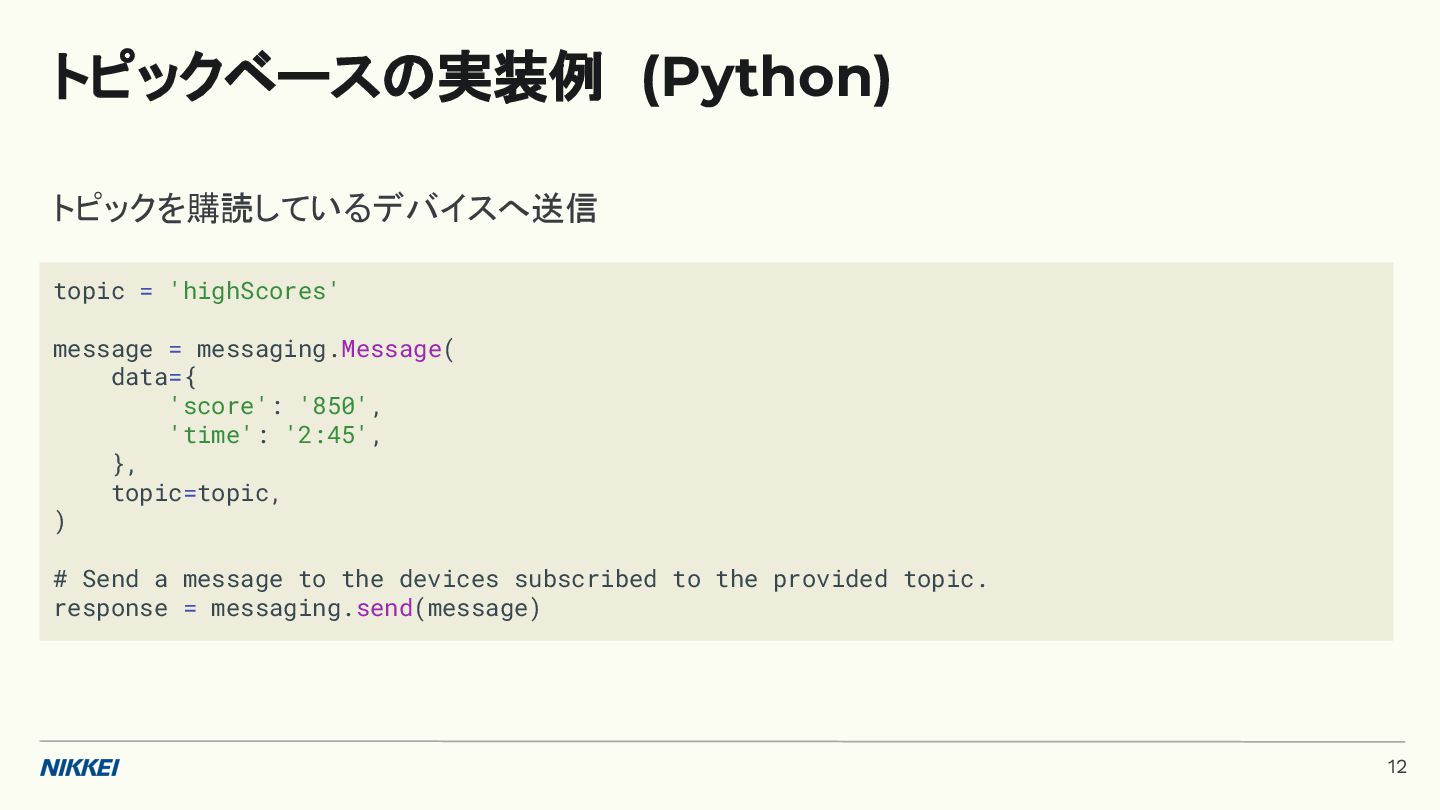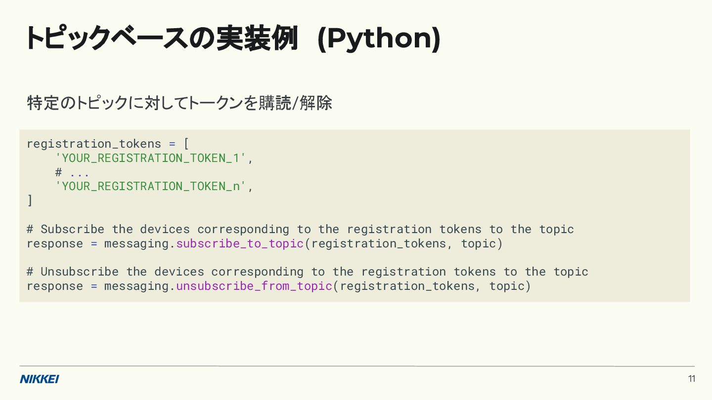 'time': '2:45', }, token=registration_token, ) response = messaging.send(message) registration_tokens = [ 'YOUR_REGISTRATION_TOKEN_1', # ... 'YOUR_REGISTRATION_TOKEN_N', ] message = messaging.MulticastMessage( data={'score': '850', 'time': '2:45'}, tokens=registration_tokens, ) response = messaging.send_each_for_multicast(message) 複数デバイスへ送信 トークンベースの実装例 (Python) 10