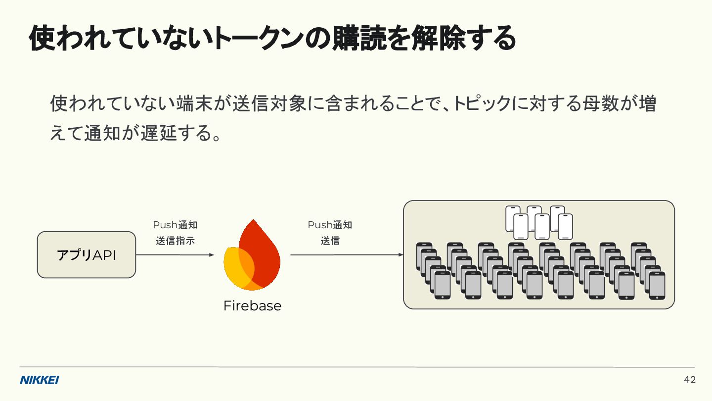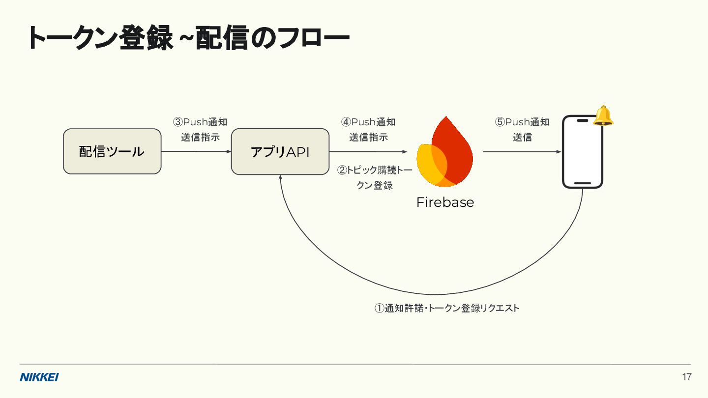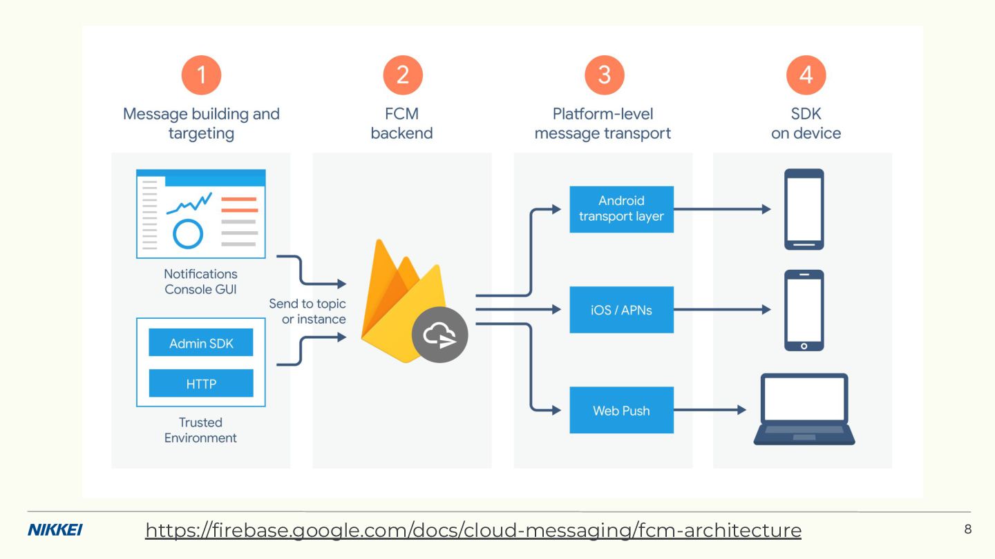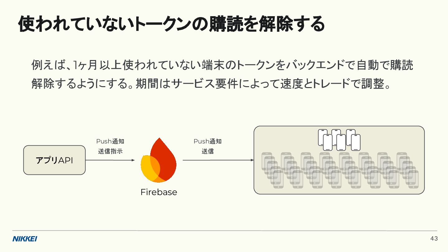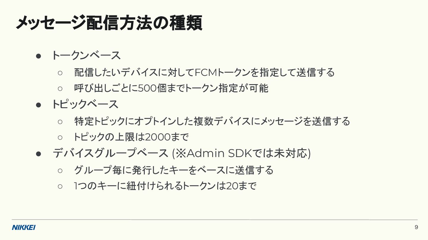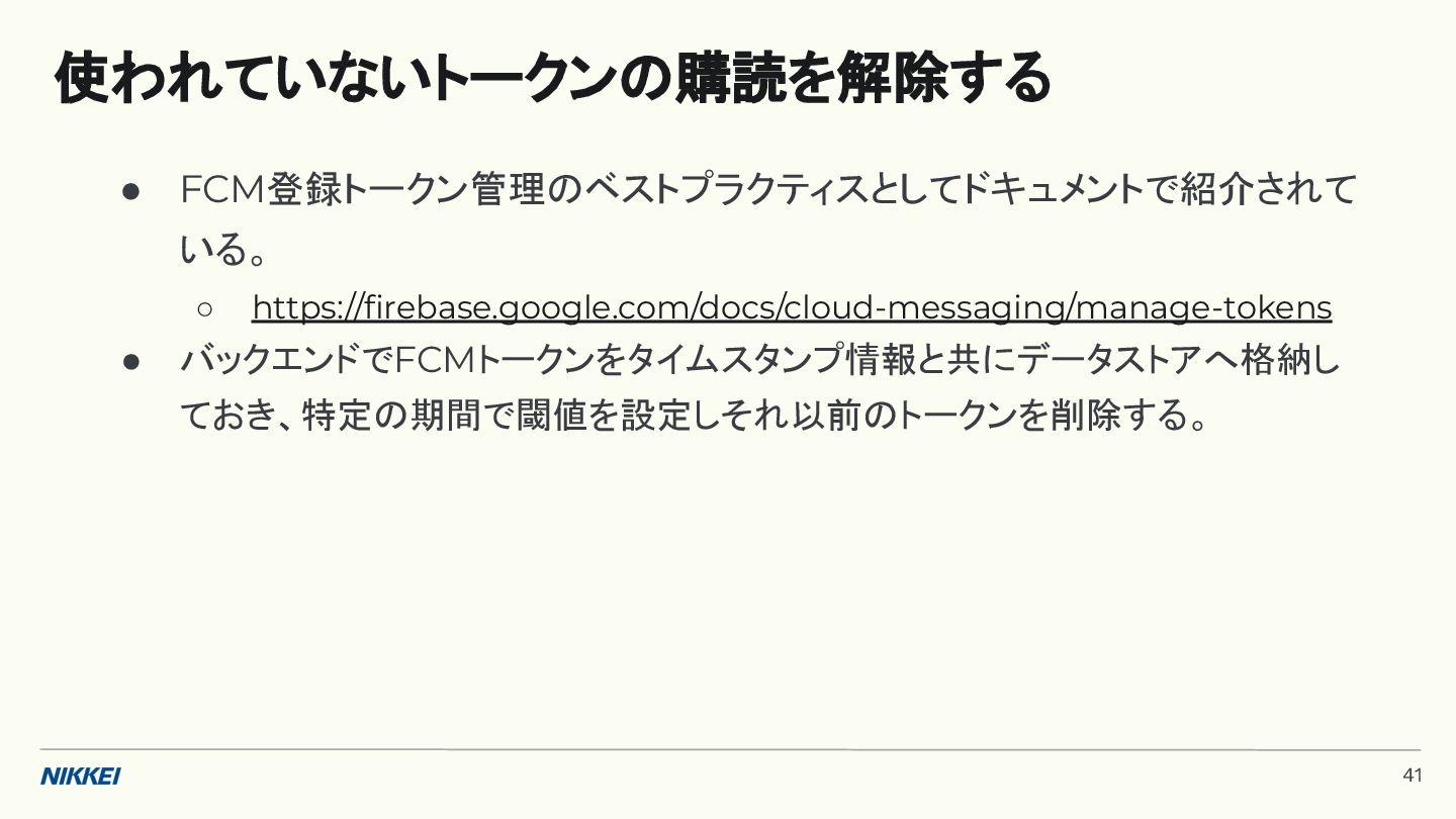 'time': '2:45', }, token=registration_token, ) response = messaging.send(message) registration_tokens = [ 'YOUR_REGISTRATION_TOKEN_1', # ... 'YOUR_REGISTRATION_TOKEN_N', ] message = messaging.MulticastMessage( data={'score': '850', 'time': '2:45'}, tokens=registration_tokens, ) response = messaging.send_each_for_multicast(message) 複数デバイスへ送信 トークンベースの実装例 (Python) 10