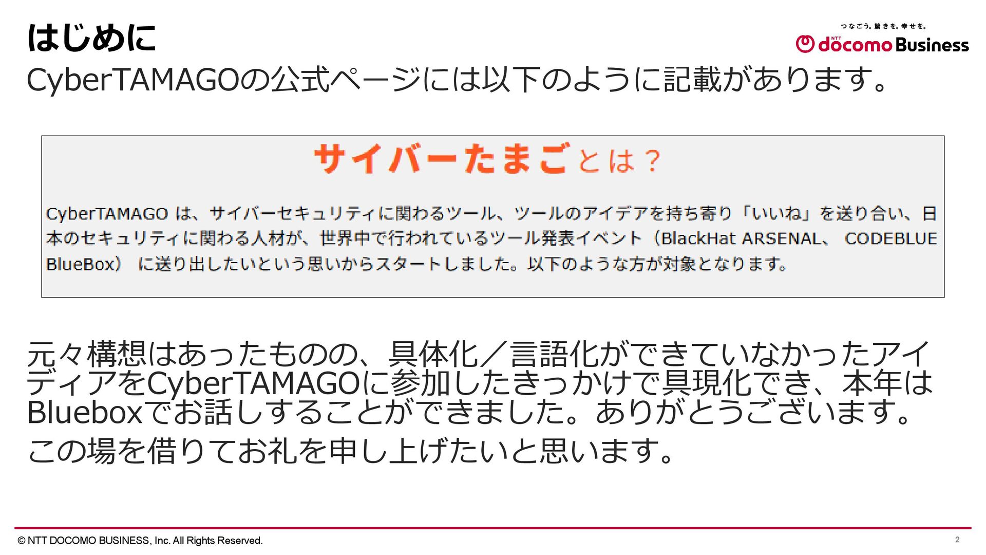 2025年11月19日に開催された「CODE BLUE 2026(https://codeblue.jp/)」にてCyberTAMAGOの枠で講演した際の講演資料です。 CyberTAMAGOについてはこちらをご覧ください https://cybertamago.org/index_ja.php