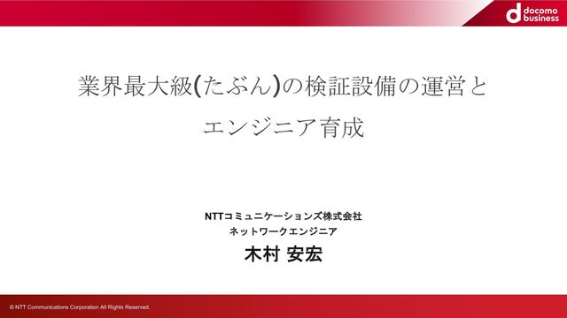 2023年3月9日のNTT Com Open TechLunch #6 で発表した「業界最大級(たぶん)の検証設備の運営とエンジニア育成」の講演資料です。 講演詳細についてはこちらを御覧ください(https://nttcom.connpass.com/event/275660/)