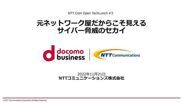 2022年11月21日のNTT Com Open TechLunch #3で発表した「元ネットワーク屋だからこそ見えるサイバー脅威のセカイ」の講演資料です。 講演詳細についてはこちらを御覧ください(https://nttcom.connpass.com/event/265846/)