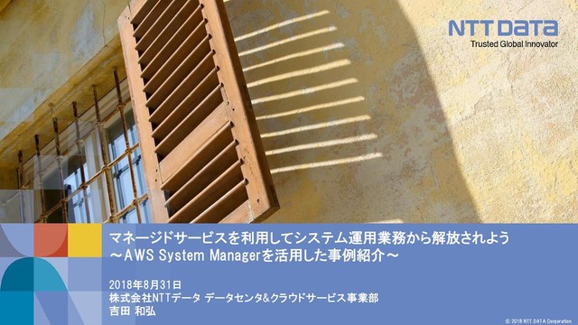セキュリティ関連の更新パッチ適用プロセスを自動化する。 未適用パッチの検査およびパッチ適用を自動化することで 重要なアップデートやゼロデイ脆弱性への対応の時間を短縮することができる。 Instances-groupA System Manager System Manager Console System Operator Internet Auto Or Manual Maintenance Windows Patch Manager 実施状況の確認 未適用パッチの検査および適用 Instances-groupB