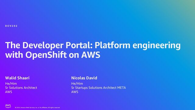 In this session, learn how to enhance the AWS Red Hat OpenShift Service on AWS (ROSA) developer experience (DX) with the latest feature, Red Hat Developer Hub (RHDH). This unified and open platform streamlines development by providing prebuilt architectures and supported approaches, centralizing technology, and enabling developers to focus on writing code and delivering features faster while adhering to security and compliance standards. Built on the open-source Backstage project, RHDH automates tasks, reduces cognitive load, and enhances the DX through standardized backing services, consistent pipelines, and seamless integration with ROSA. Leveraging Red Hat's expertise in open-source projects, this transformative portal empowers organizations to drive agility, innovation, and fostering collaboration through shared dashboards and insights.