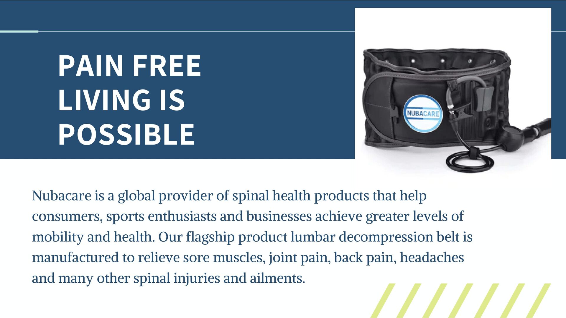 of spinal health products that help consumers, sports enthusiasts and businesses achieve greater levels of mobility and health. Our flagship product lumbar decompression belt is manufactured to relieve sore muscles, joint pain, back pain, headaches and many other spinal injuries and ailments.