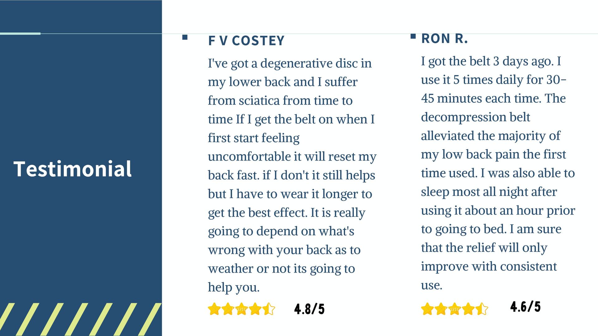 my lower back and I suffer from sciatica from time to time If I get the belt on when I first start feeling uncomfortable it will reset my back fast. if I don't it still helps but I have to wear it longer to get the best effect. It is really going to depend on what's wrong with your back as to weather or not its going to help you. RON R. I got the belt 3 days ago. I use it 5 times daily for 30- 45 minutes each time. The decompression belt alleviated the majority of my low back pain the first time used. I was also able to sleep most all night after using it about an hour prior to going to bed. I am sure that the relief will only improve with consistent use. 4.8/5 4.6/5