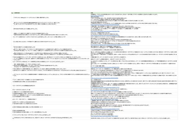 No ご質問内容 回答 34 移行前に、重複アカウントを確認できるのでしょうか? ご認識の通り、移行前に重複アカウントを確認することは可能です。 以下のヘルプページの【4. メールアドレスを共用しているアカウントを整理する】をご覧くださいませ。 https://support-ja.backlog.com/hc/ja/articles/360035647094 35