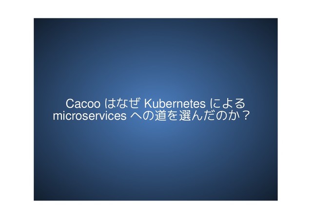 2018年11月22日に福岡で開催された「Geeks Who Drink -自社プロダクト運用 Edition-」にて、Cacoo チームの中原正二が、KubernetesによるCacooのアーキテクチャのmicroservices化について発表しました。