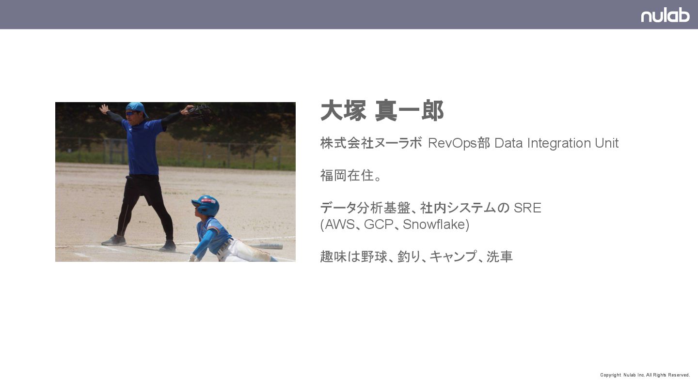 Rights Reserved. 大塚 真一郎 株式会社ヌーラボ RevOps部 Data Integration Unit 福岡在住。 データ分析基盤、社内システムの SRE (AWS、GCP、Snowflake) 趣味は野球、釣り、キャンプ、洗車