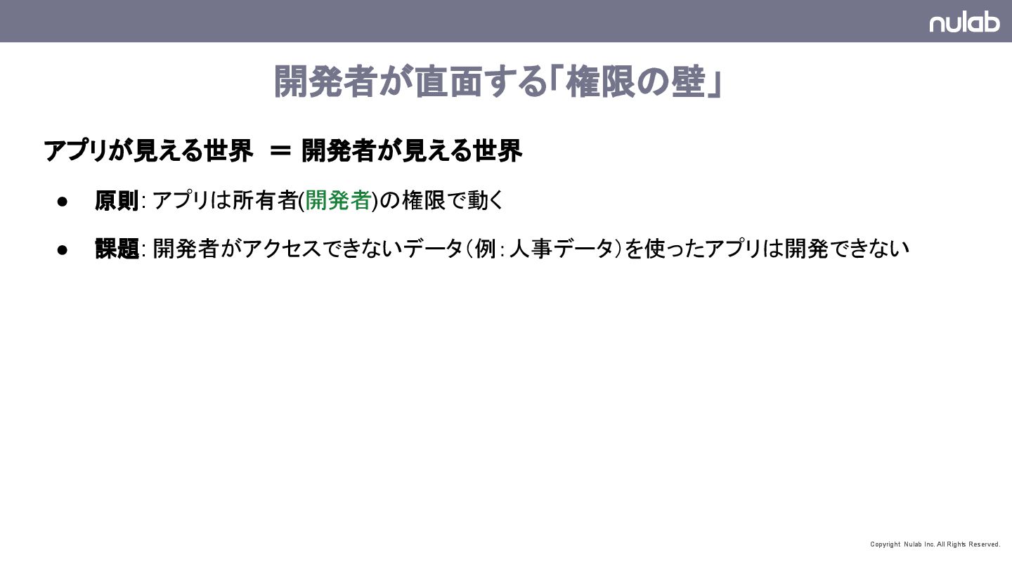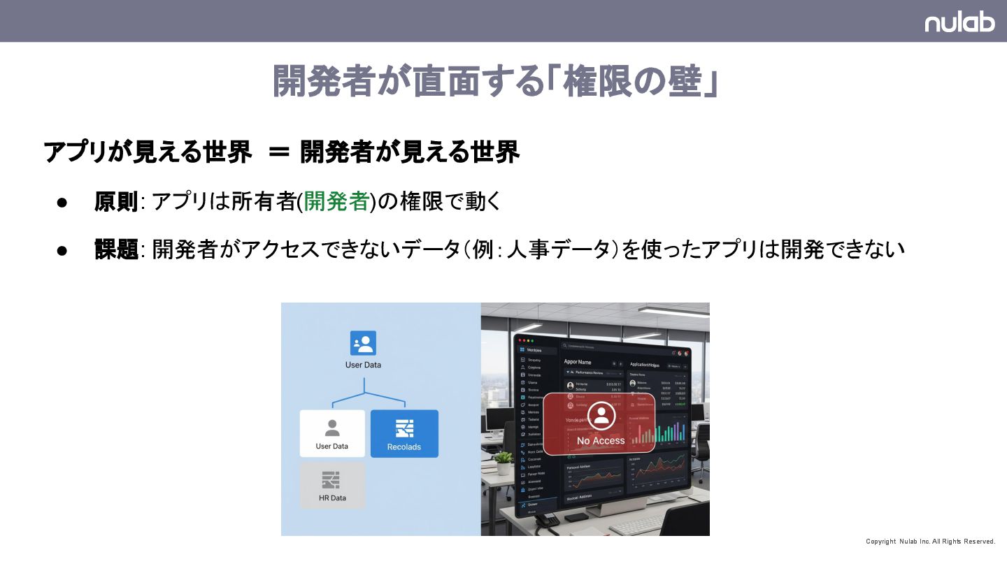 Rights Reserved. 開発者が直面する「権限の壁」 アプリが見える世界 = 開発者が見える世界 • 原則: アプリは所有者(開発者)の権限で動く • 課題: 開発者がアクセスできないデータ(例:人事データ)を使ったアプリは開発できない