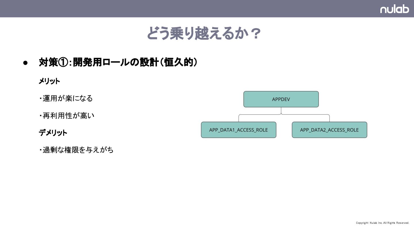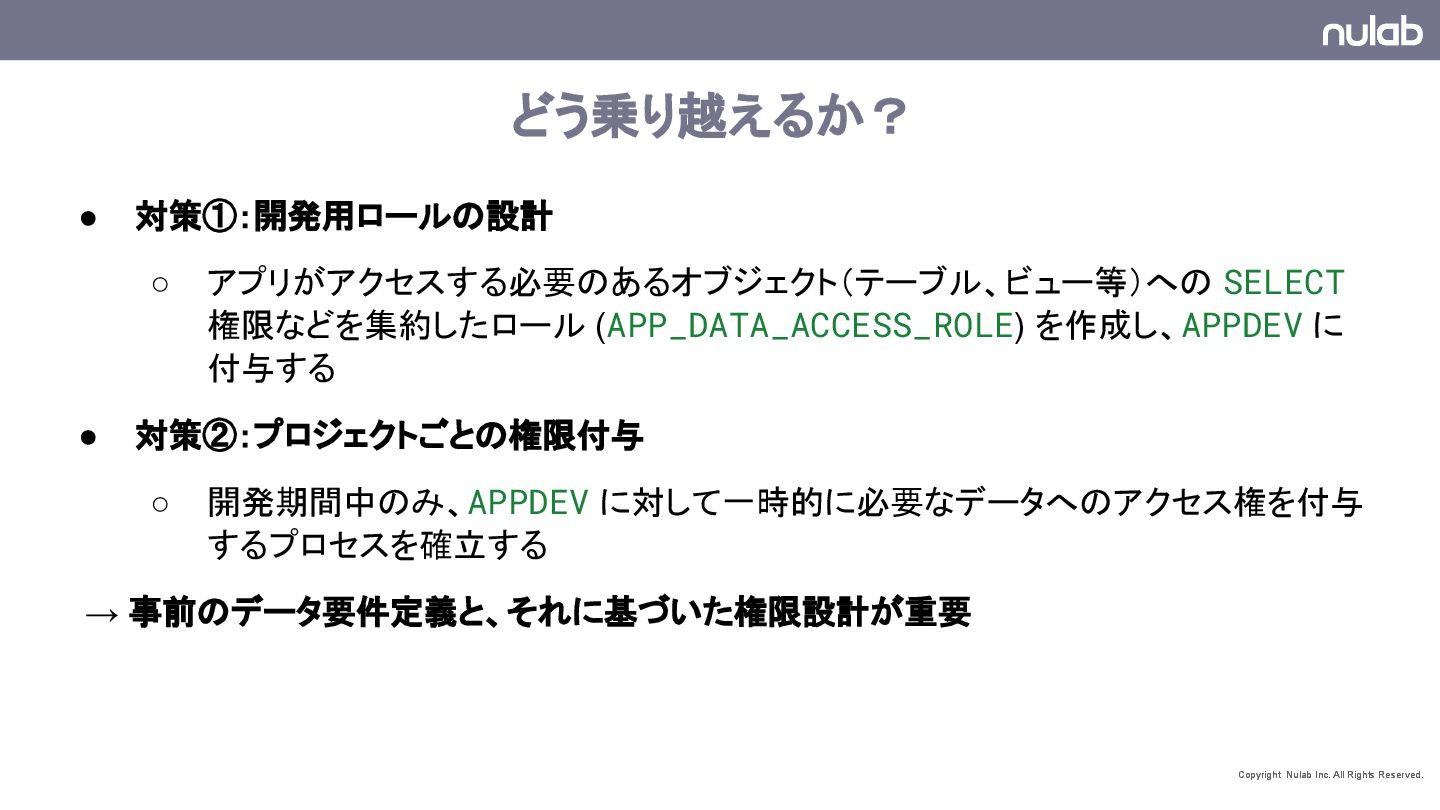 Rights Reserved. どう乗り越えるか? • 対策①:開発用ロールの設計 ◦ アプリがアクセスする必要のあるオブジェクト(テーブル、ビュー等)への SELECT 権限などを集約したロール (APP_DATA_ACCESS_ROLE) を作成し、APPDEV に 付与する • 対策②:プロジェクトごとの権限付与 ◦ 開発期間中のみ、APPDEV に対して一時的に必要なデータへのアクセス権を付与 するプロセスを確立する → 事前のデータ要件定義と、それに基づいた権限設計が重要