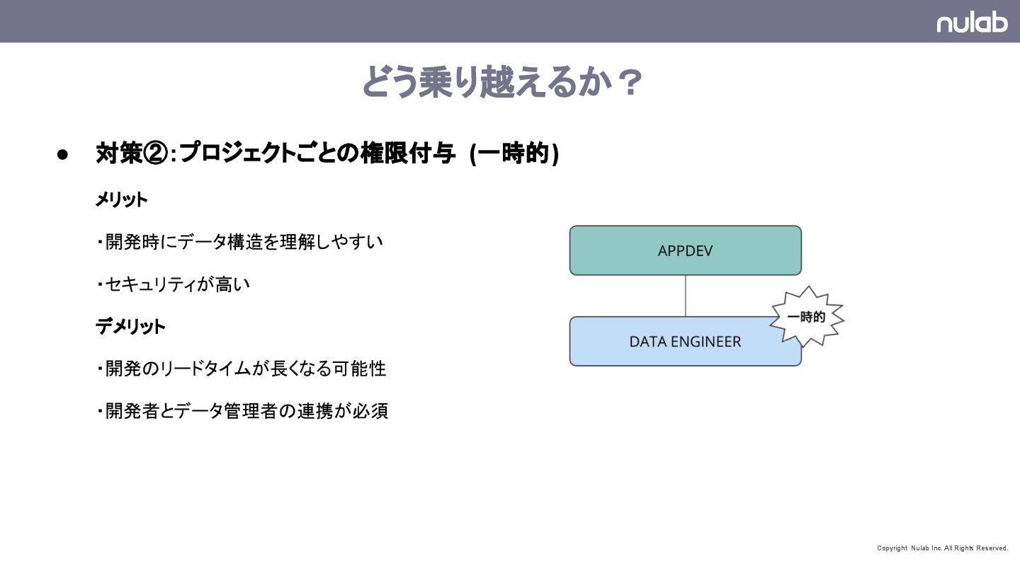 Rights Reserved. どう乗り越えるか? • 対策②:プロジェクトごとの権限付与 (一時的) メリット ・開発時にデータ構造を理解しやすい ・セキュリティが高い デメリット ・開発のリードタイムが長くなる可能性 ・開発者とデータ管理者の連携が必須