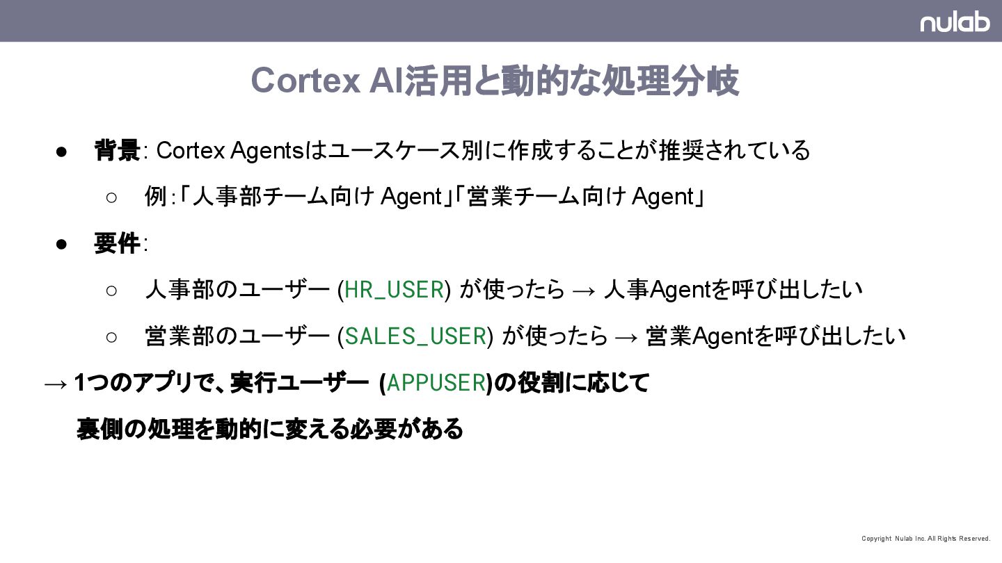 Rights Reserved. Cortex AI活用と動的な処理分岐 • 背景: Cortex Agentsはユースケース別に作成することが推奨されている ◦ 例:「人事部チーム向け Agent」「営業チーム向け Agent」 • 要件: ◦ 人事部のユーザー (HR_USER) が使ったら → 人事Agentを呼び出したい ◦ 営業部のユーザー (SALES_USER) が使ったら → 営業Agentを呼び出したい → 1つのアプリで、実行ユーザー (APPUSER)の役割に応じて 裏側の処理を動的に変える必要がある