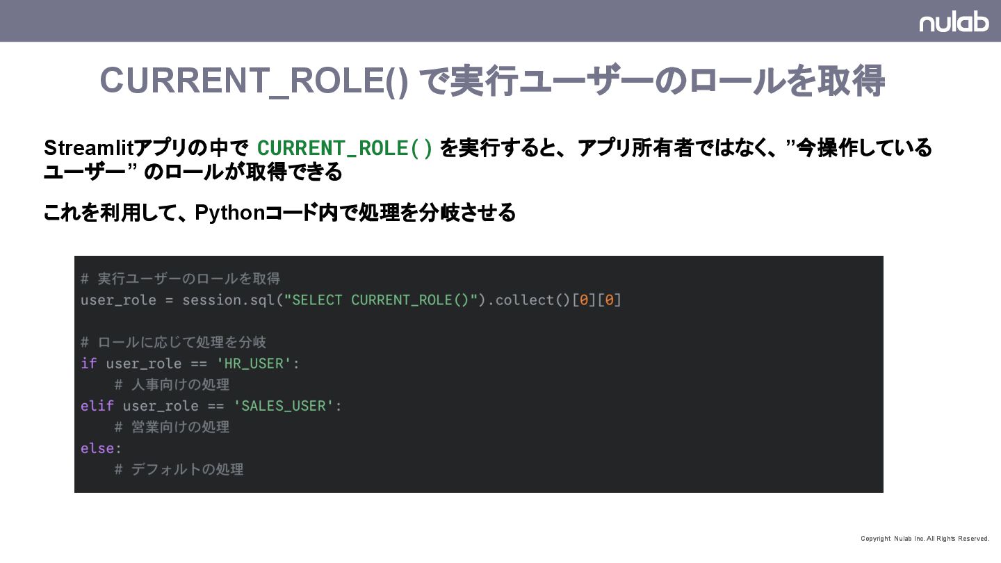 Rights Reserved. CURRENT_ROLE() で実行ユーザーのロールを取得 Streamlitアプリの中で CURRENT_ROLE() を実行すると、 アプリ所有者ではなく、 ”今操作している ユーザー” のロールが取得できる これを利用して、 Pythonコード内で処理を分岐させる