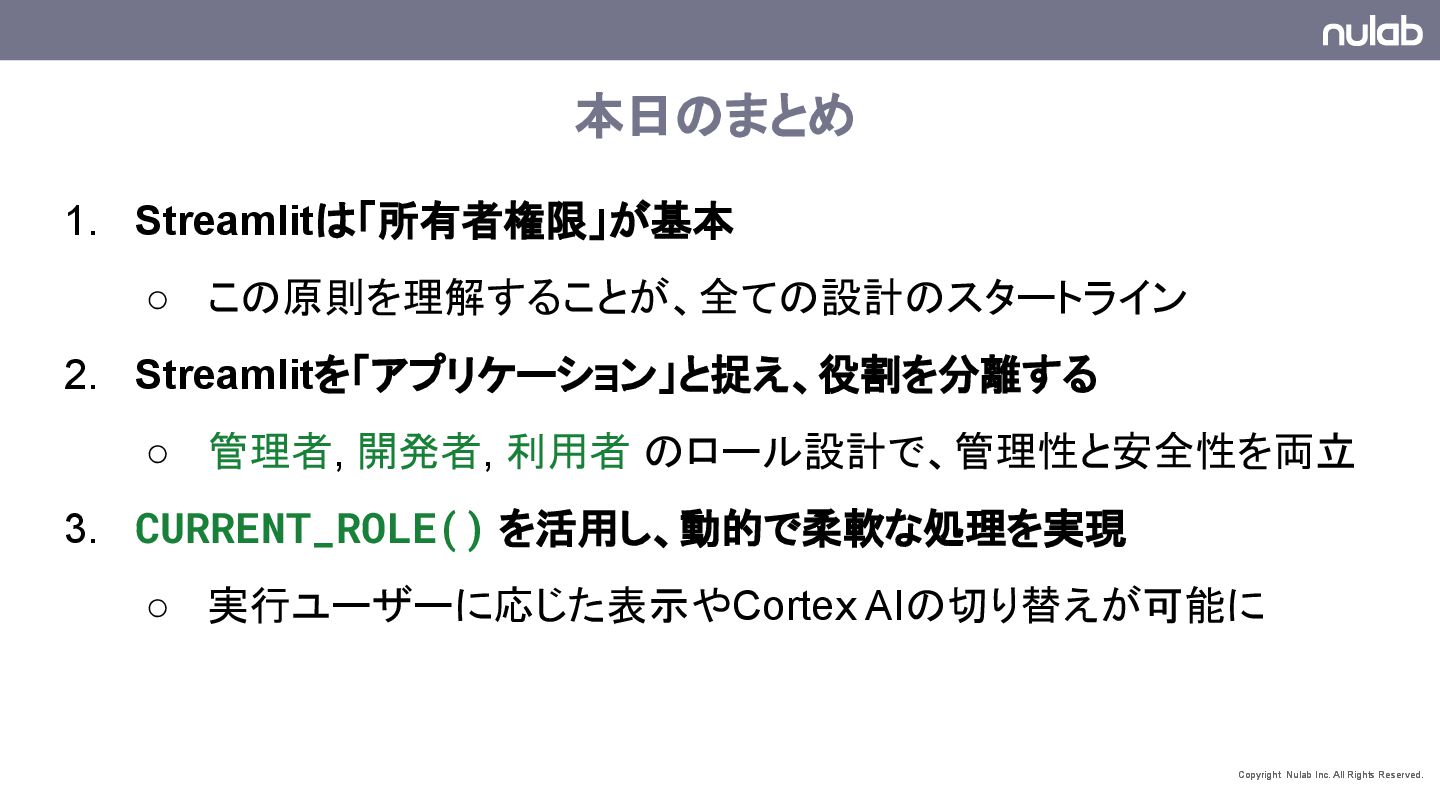 Rights Reserved. 本日のまとめ 1. Streamlitは「所有者権限」が基本 ◦ この原則を理解することが、全ての設計のスタートライン 2. Streamlitを「アプリケーション」と捉え、役割を分離する ◦ 管理者, 開発者, 利用者 のロール設計で、管理性と安全性を両立 3. CURRENT_ROLE() を活用し、動的で柔軟な処理を実現 ◦ 実行ユーザーに応じた表示やCortex AIの切り替えが可能に