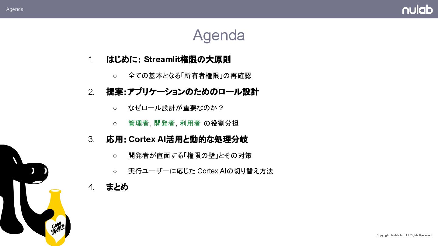 Rights Reserved. Agenda 1. はじめに: Streamlit権限の大原則 ◦ 全ての基本となる「所有者権限」の再確認 2. 提案:アプリケーションのためのロール設計 ◦ なぜロール設計が重要なのか? ◦ 管理者, 開発者, 利用者 の役割分担 3. 応用:Cortex AI活用と動的な処理分岐 ◦ 開発者が直面する「権限の壁」とその対策 ◦ 実行ユーザーに応じた Cortex AIの切り替え方法 4. まとめ Agenda