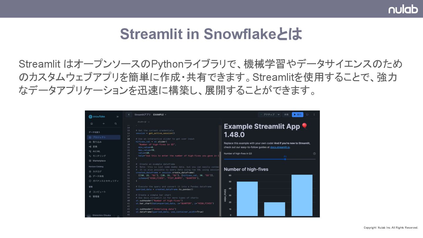 Rights Reserved. Streamlit in Snowflakeとは Streamlit はオープンソースのPythonライブラリで、機械学習やデータサイエンスのため のカスタムウェブアプリを簡単に作成・共有できます。Streamlitを使用することで、強力 なデータアプリケーションを迅速に構築し、展開することができます。