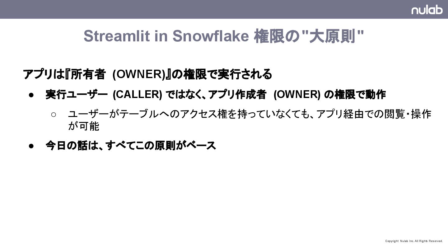Rights Reserved. Streamlit in Snowflake 権限の"大原則" アプリは『所有者 (OWNER)』の権限で実行される • 実行ユーザー (CALLER) ではなく、アプリ作成者 (OWNER) の権限で動作 ◦ ユーザーがテーブルへのアクセス権を持っていなくても、アプリ経由での閲覧・操作 が可能 • 今日の話は、すべてこの原則がベース