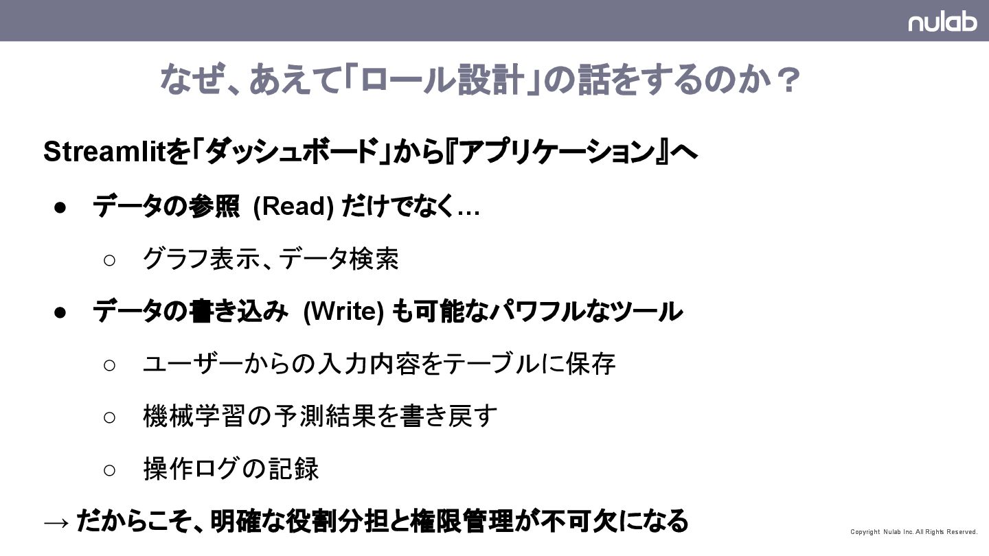 Copyright Nulab Inc. All Rights Reserved. Streamlitとロール関連の話 セキュアで柔軟なアプリ開発を実現する Streamlit in