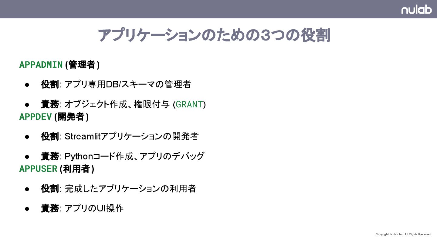 Rights Reserved. アプリケーションのための3つの役割 APPADMIN (管理者) • 役割: アプリ専用DB/スキーマの管理者 • 責務: オブジェクト作成、権限付与 (GRANT) APPDEV (開発者) • 役割: Streamlitアプリケーションの開発者 • 責務: Pythonコード作成、アプリのデバッグ APPUSER (利用者) • 役割: 完成したアプリケーションの利用者 • 責務: アプリのUI操作