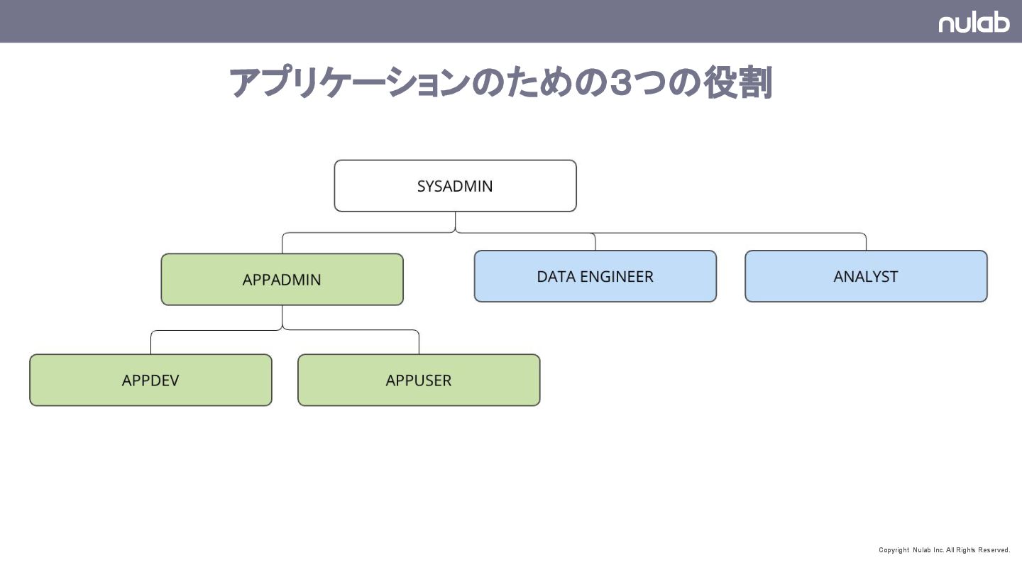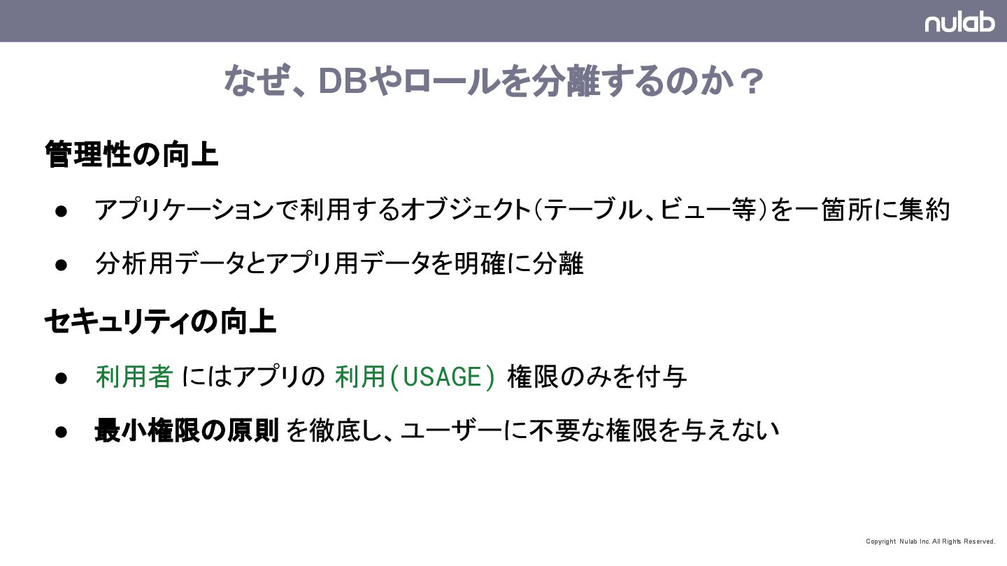 Rights Reserved. なぜ、DBやロールを分離するのか? 管理性の向上 • アプリケーションで利用するオブジェクト(テーブル、ビュー等)を一箇所に集約 • 分析用データとアプリ用データを明確に分離 セキュリティの向上 • 利用者 にはアプリの 利用(USAGE) 権限のみを付与 • 最小権限の原則 を徹底し、ユーザーに不要な権限を与えない