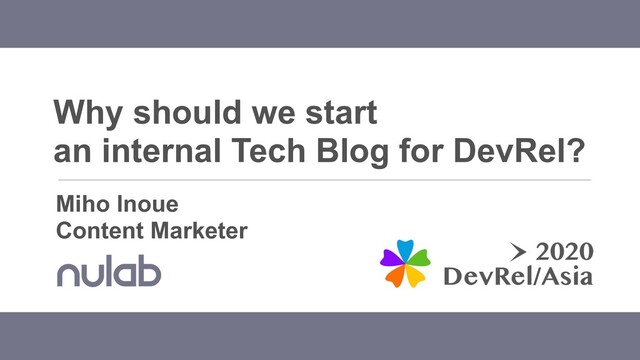 Miho Inoue, who is a Content Marketer at Nulab inc had a presentation on "Why should we start an internal Tech Blog for DevRel?" at DevRel Asia 2020.