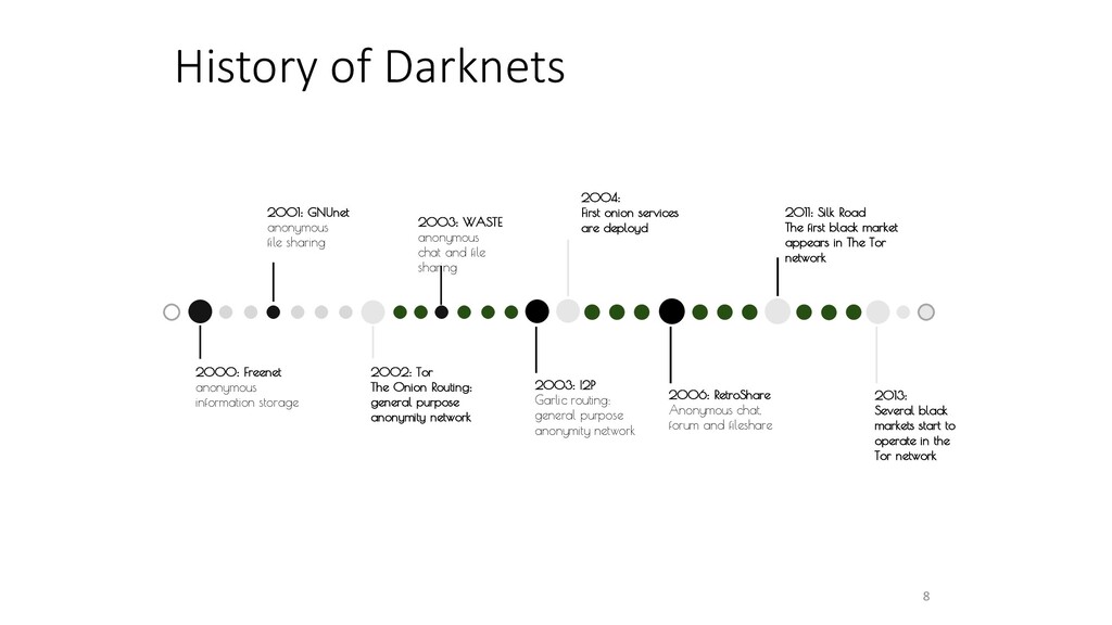 Tor The Onion Routing: general purpose anonymity network 2003: I2P Garlic routing: general purpose anonymity network 2001: GNUnet anonymous file sharing 2003: WASTE anonymous chat and file sharing 2004: First onion services are deployd 2006: RetroShare Anonymous chat, forum and fileshare 2011: Silk Road The first black market appears in The Tor network 2013: Several black markets start to operate in the Tor network
