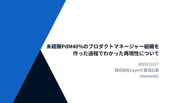 未経験PdM40%のプロダクトマネージャー組織を 作った過程でわかった再現性について 2025/12/17 株式会社LayerX 飯沼広基 (numashi)