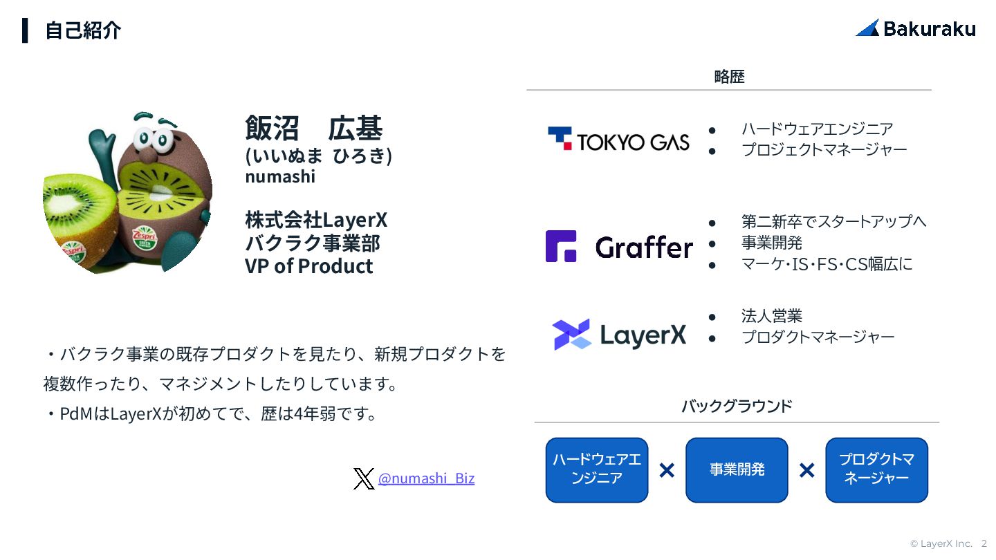 バクラク事業部 VP of Product 略歴 • ハードウェアエンジニア • プロジェクトマネージャー ‧バクラク事業の既存プロダクトを⾒たり、新規プロダクトを 複数作ったり、マネジメントしたりしています。 ‧PdMはLayerXが初めてで、歴は4年弱です。 @numashi_Biz • 法人営業 • プロダクトマネージャー 事業開発 ハードウェアエ ンジニア プロダクトマ ネージャー バックグラウンド • 第二新卒でスタートアップへ • 事業開発 • マーケ・IS・FS・CS幅広に