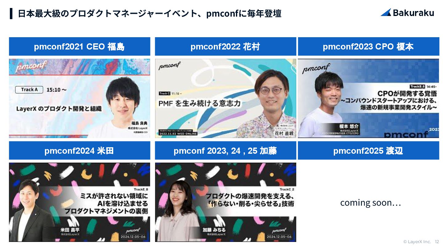 © LayerX Inc. 12 ⽇本最⼤級のプロダクトマネージャーイベント、pmconfに毎年登壇 pmconf2023 CPO 榎本 pmconf2022 花村